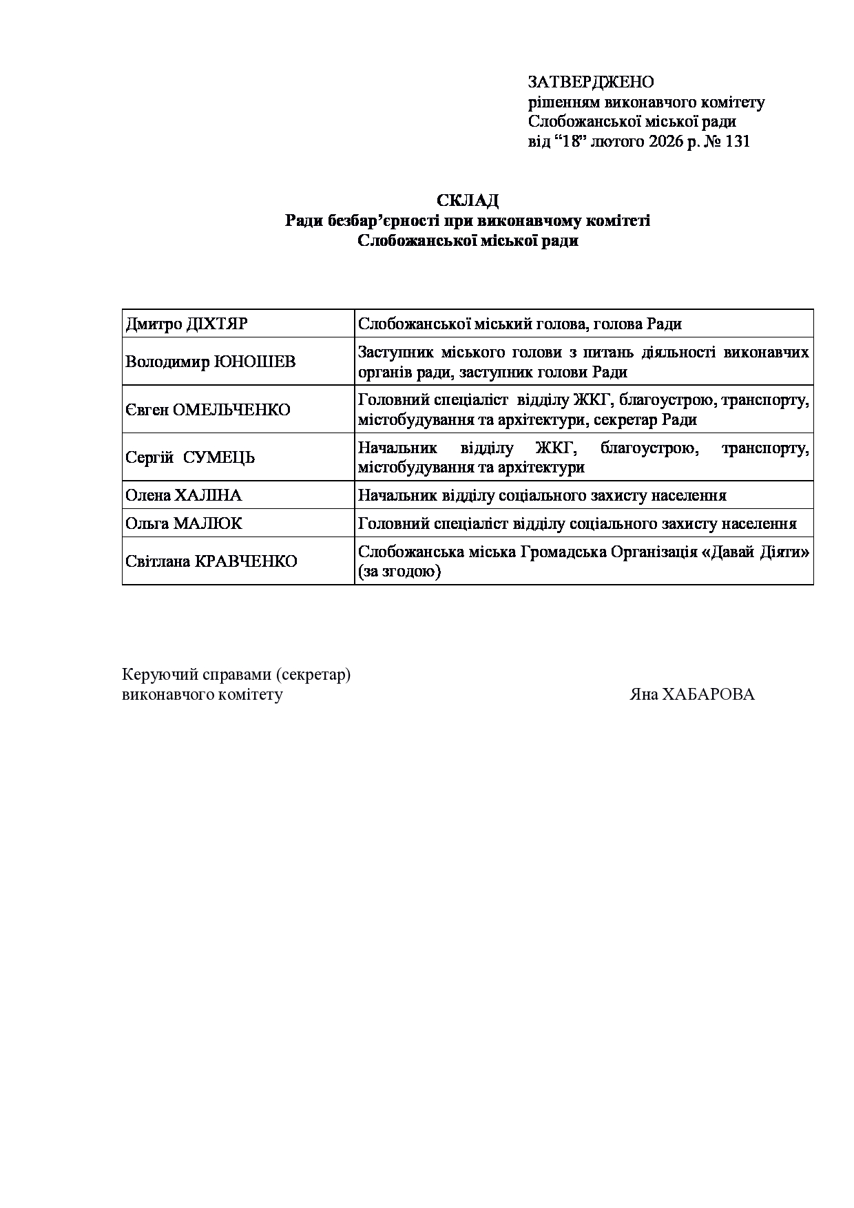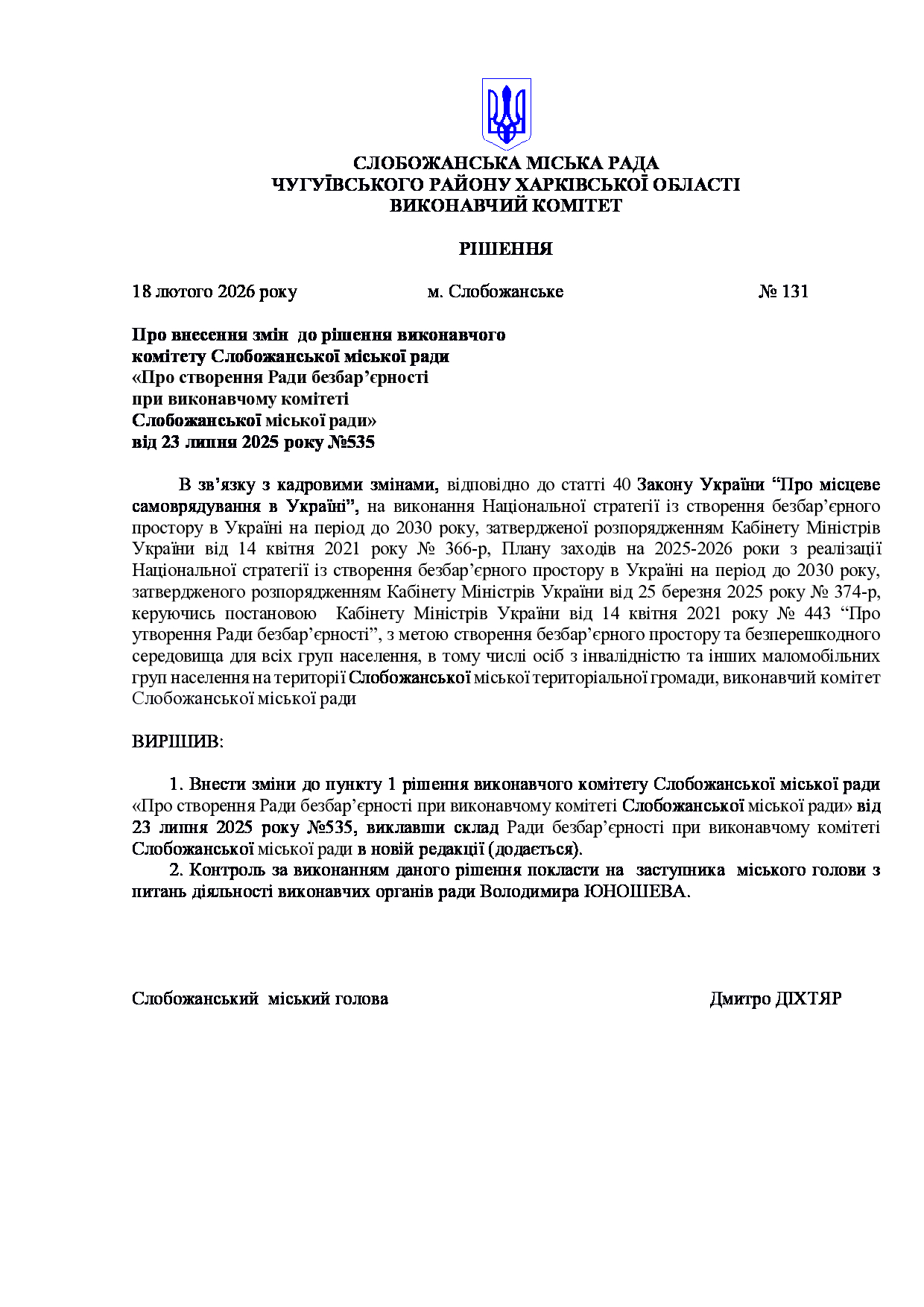 Рішення виконавчого комітету №131 Про внесення змін до рішення виконавчого комітету Слобожанської міської ради «Про створення Ради безбар’єрності при виконавчому комітеті Слобожанської міської ради» від 23 липня 2025 року №535.