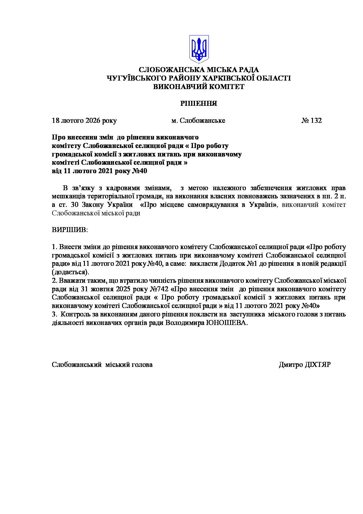 Рішення виконавчого комітету №132 Про внесення змін до рішення виконавчого комітету Слобожанської селищної ради « Про роботу громадської комісії з житлових питань при виконавчому комітеті Слобожанської селищної ради » від 11 лютого 2021 року №40.