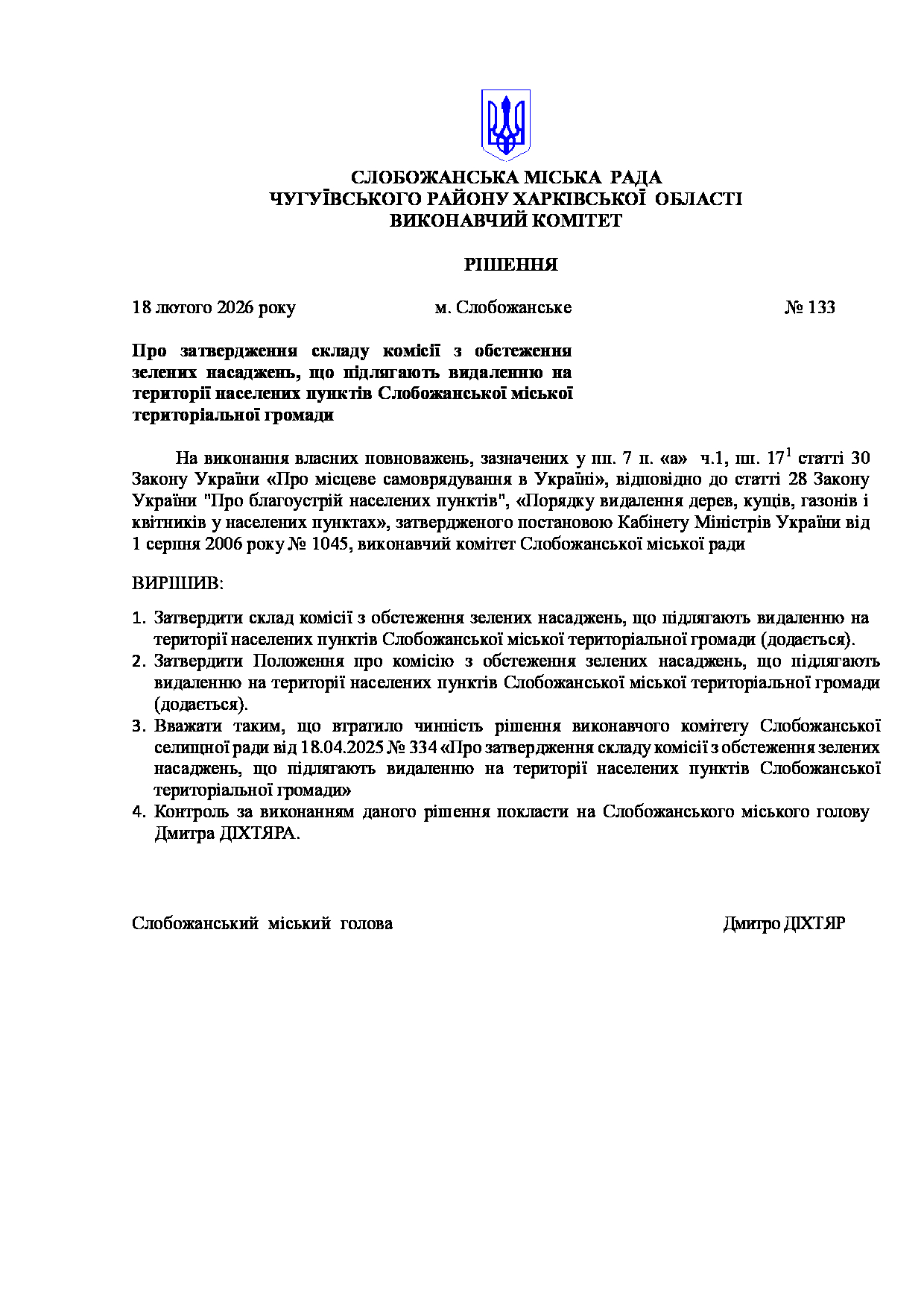 Рішення виконавчого комітету №133 Про затвердження складу комісії з обстеження зелених насаджень, що підлягають видаленню на території населених пунктів Слобожанської міської територіальної громади.