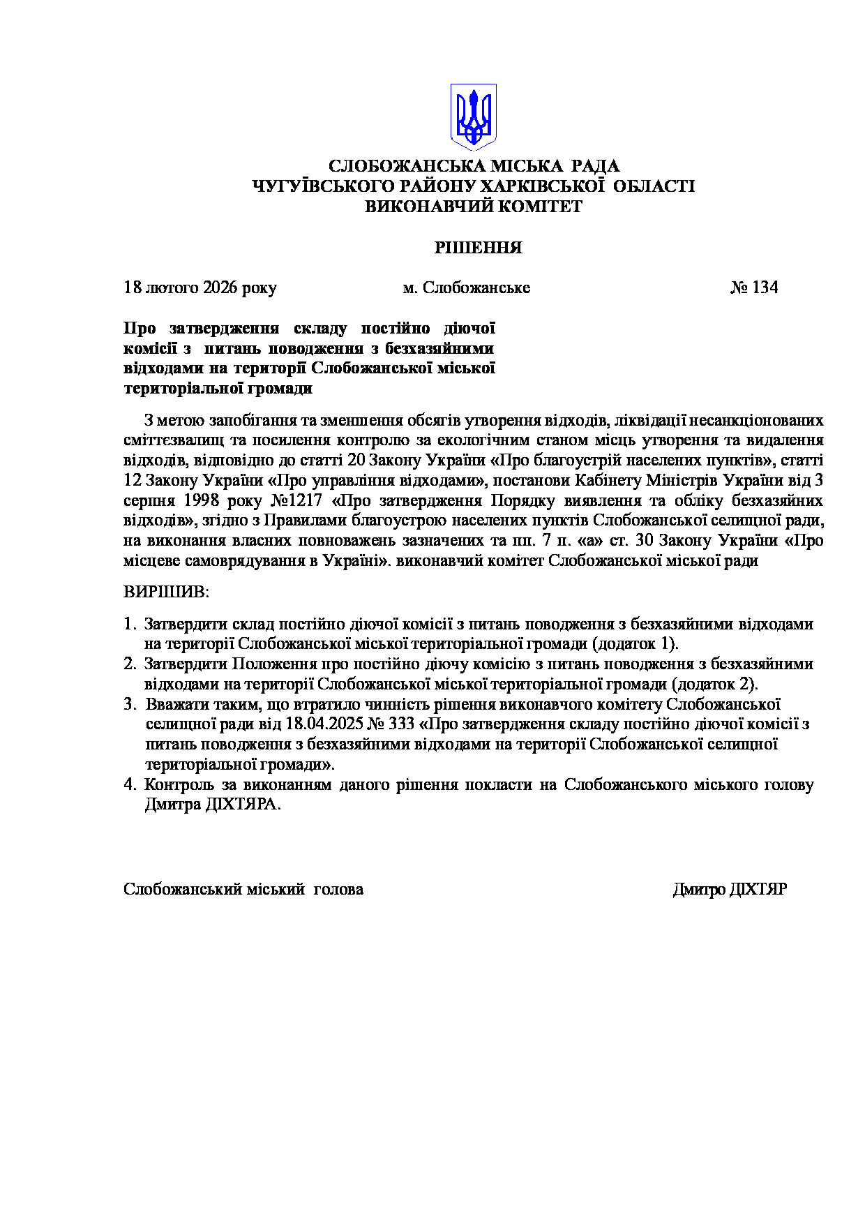 Рішення виконавчого комітету №134 Про затвердження складу постійно діючої комісії з питань поводження з безхазяйними відходами на території Слобожанської міської територіальної громади .