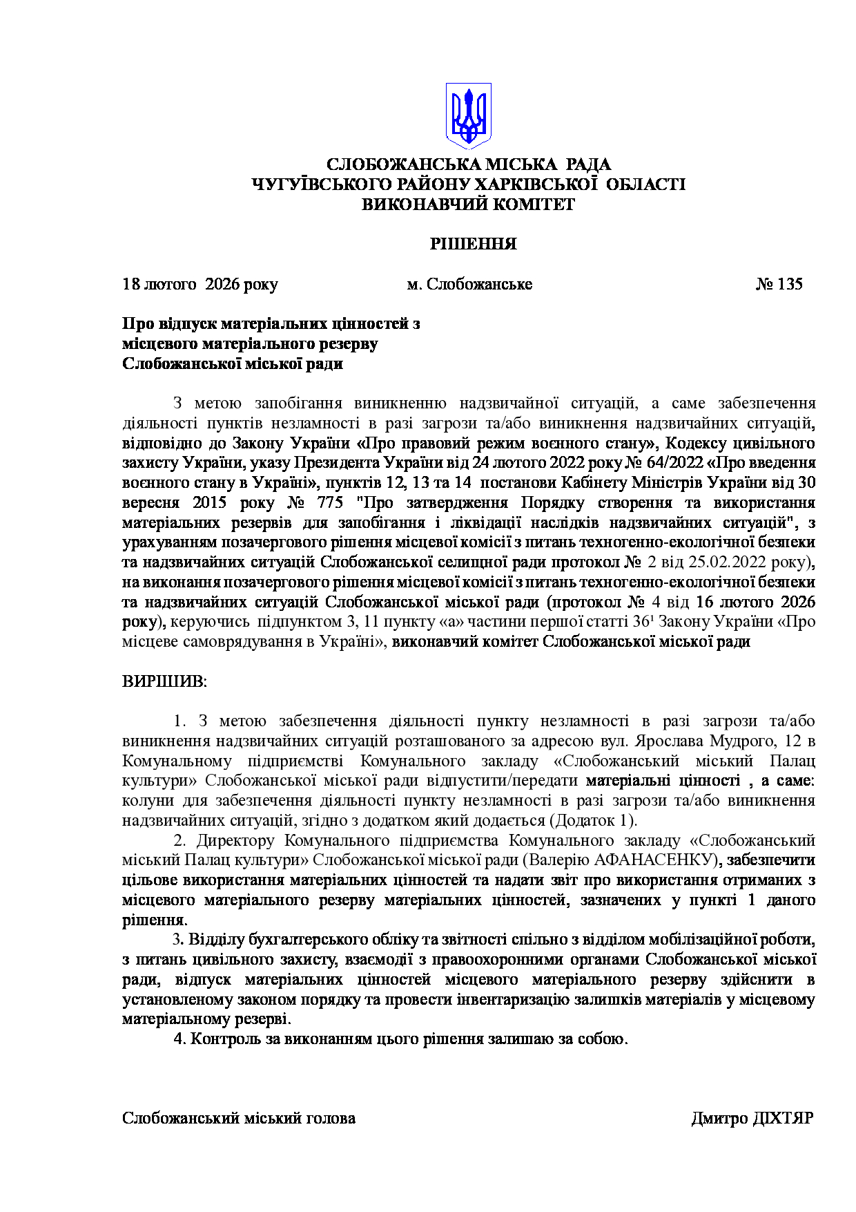 Рішення виконавчого комітету №135 Про відпуск матеріальних цінностей з місцевого матеріального резерву Слобожанської міської ради.