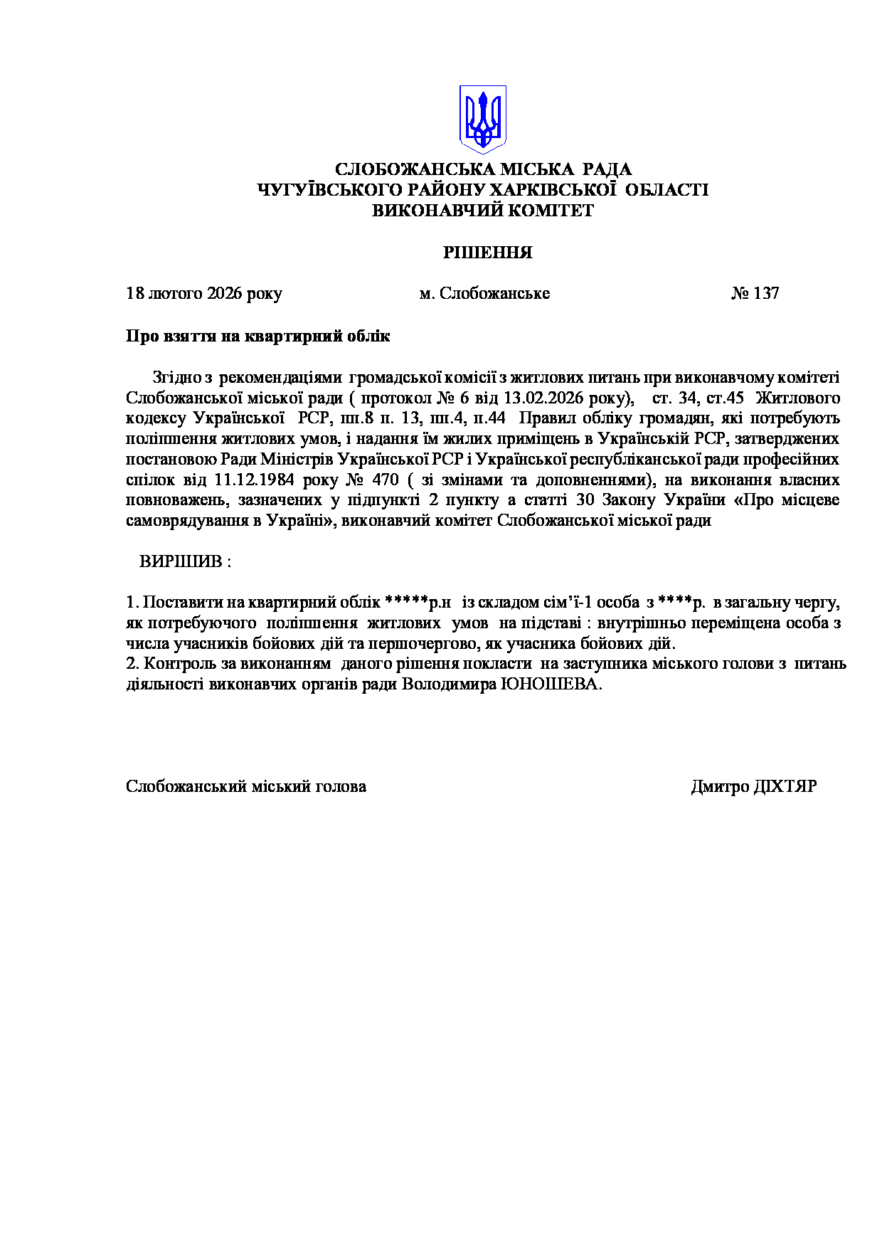 Рішення виконавчого комітету №137 Про взяття на квартирний облік.