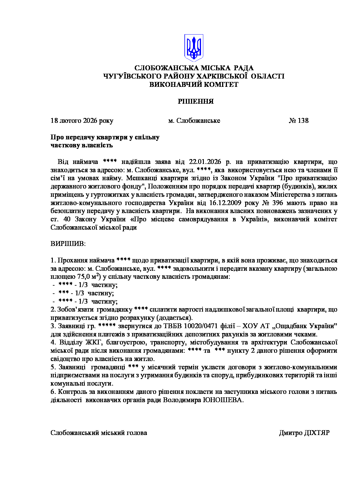 Рішення виконавчого комітету №138 Про передачу квартири у спільну часткову власність.