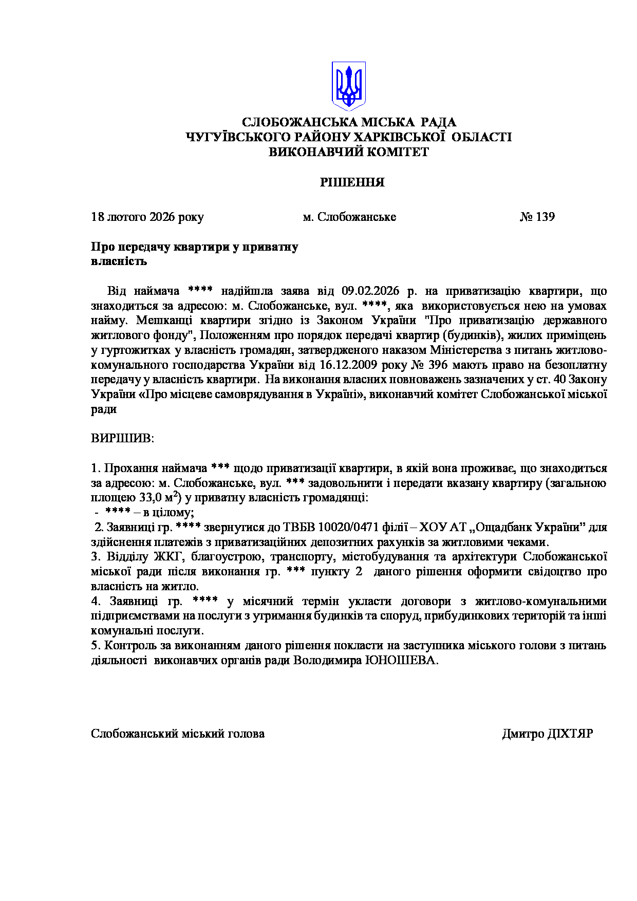 Рішення виконавчого комітету №139 Про передачу квартири у приватну власність.