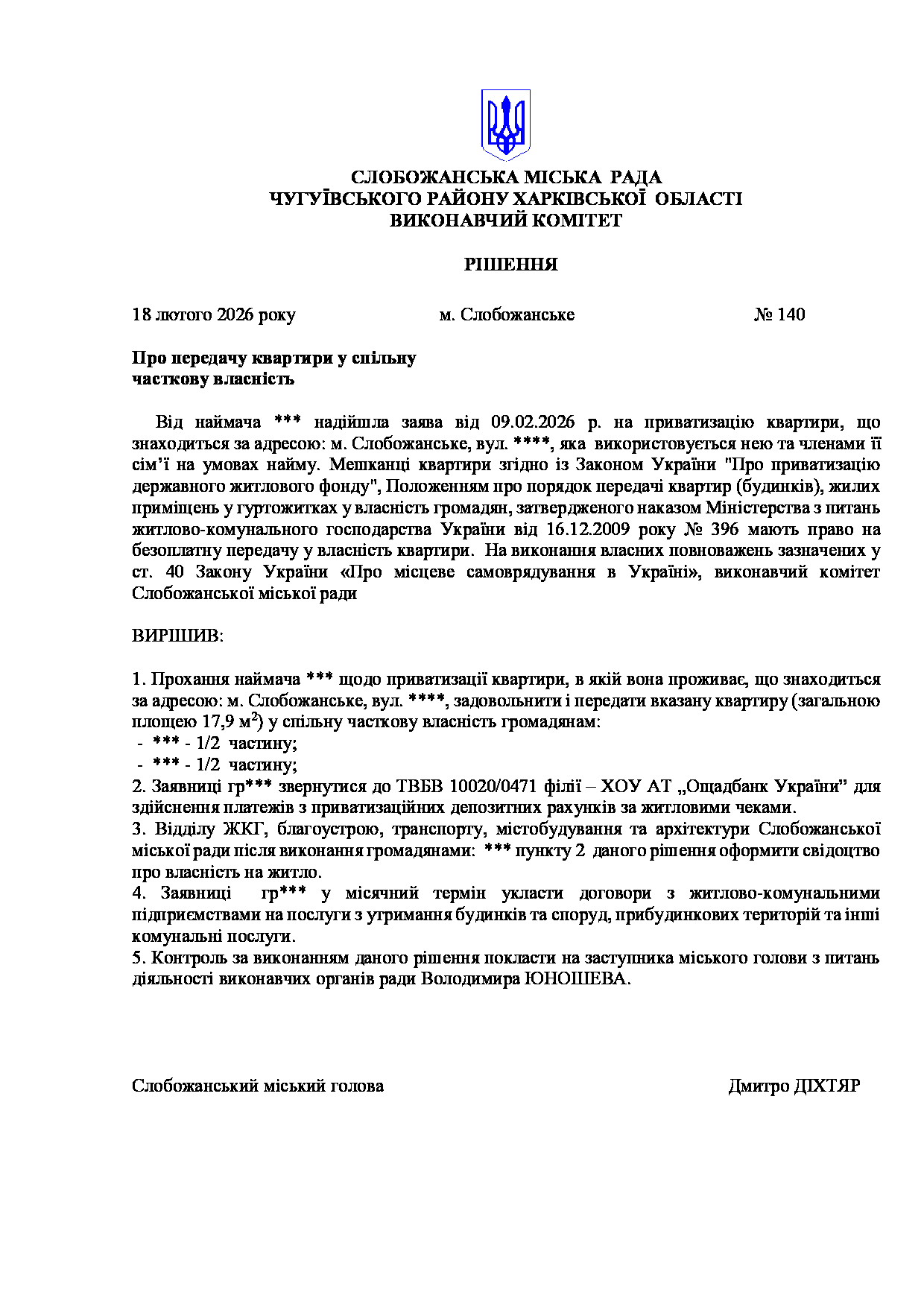 Рішення виконавчого комітету №140 Про передачу квартири у спільну часткову власність.