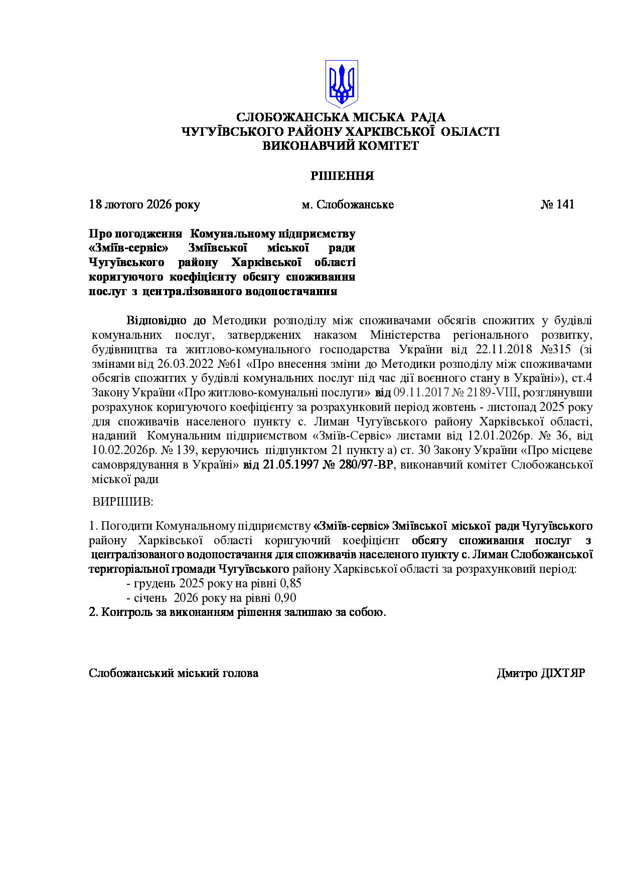Рішення виконавчого комітету №141 Про погодження Комунальному підприємству «Зміїв-сервіс» Зміївської міської ради Чугуївського району Харківської області коригуючого коефіцієнту обсягу споживання послуг з централізованого водопостачання.