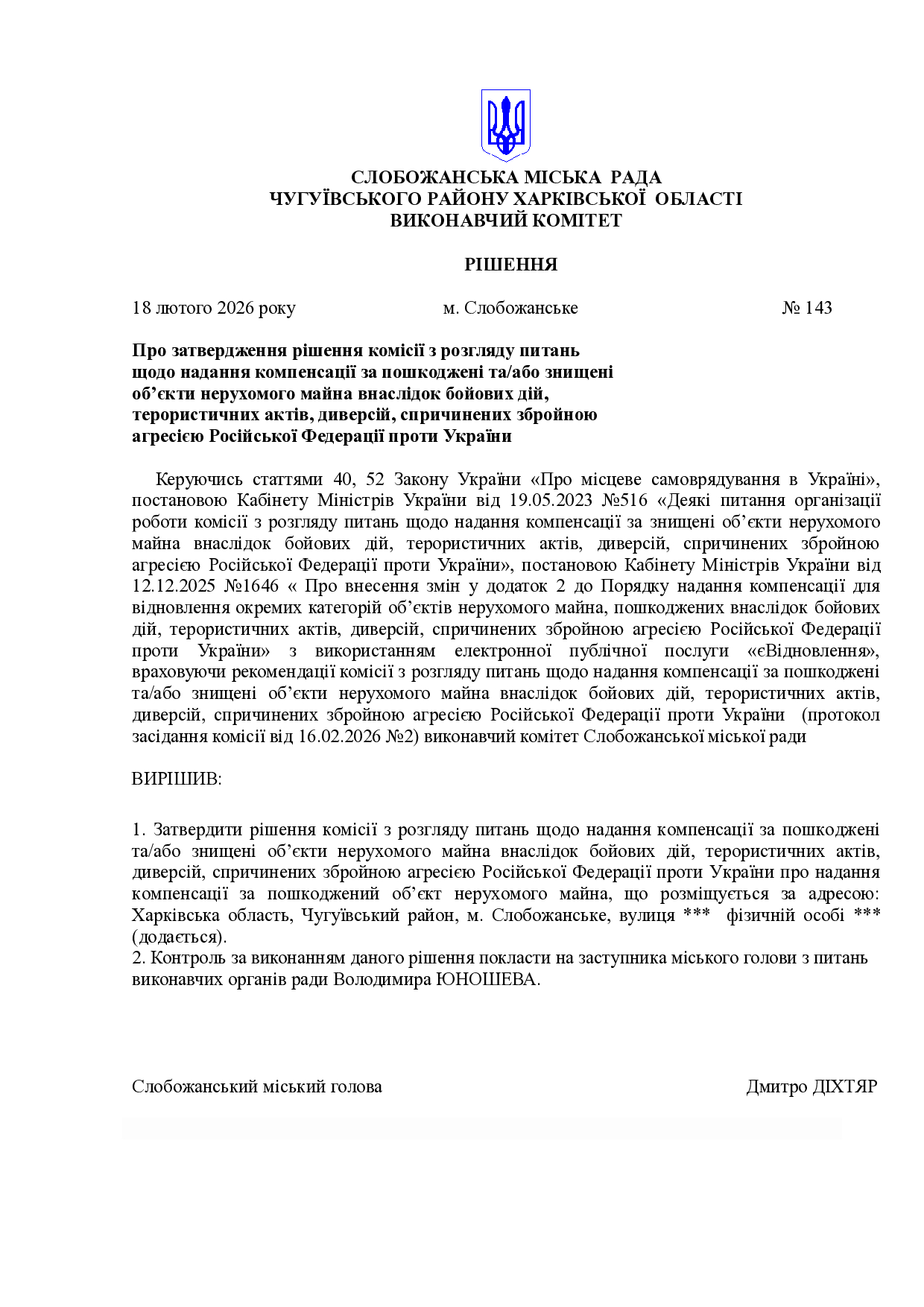 Рішення виконавчого комітету №143 Про затвердження рішення комісії з розгляду питань щодо надання компенсації за пошкоджені та/або знищені об’єкти нерухомого майна внаслідок бойових дій, терористичних актів, диверсій, спричинених збройною агресією Російської Федерації проти України.