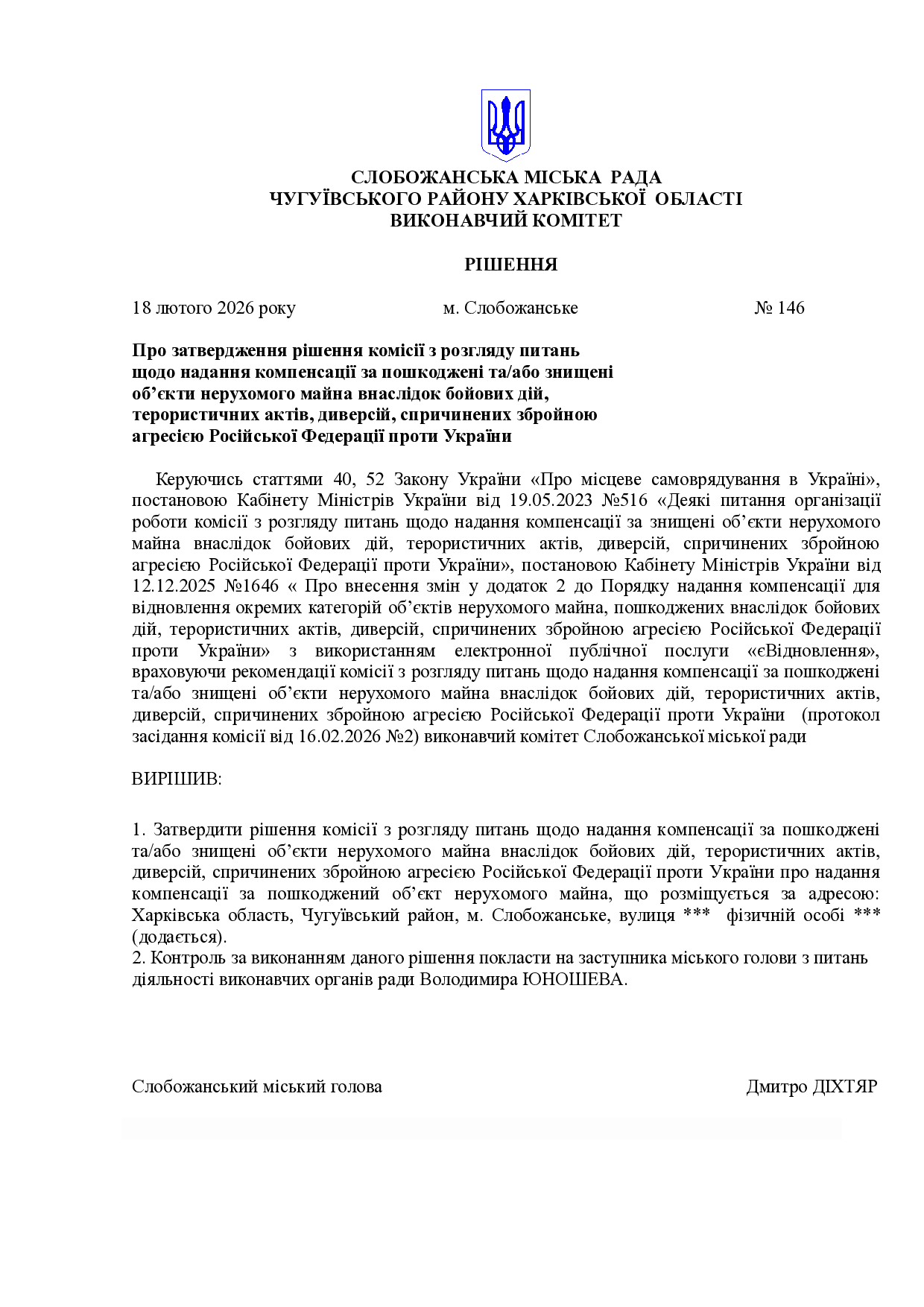 Рішення виконавчого комітету №146 Про затвердження рішення комісії з розгляду питань щодо надання компенсації за пошкоджені та/або знищені об’єкти нерухомого майна внаслідок бойових дій, терористичних актів, диверсій, спричинених збройною агресією Російської Федерації проти України.