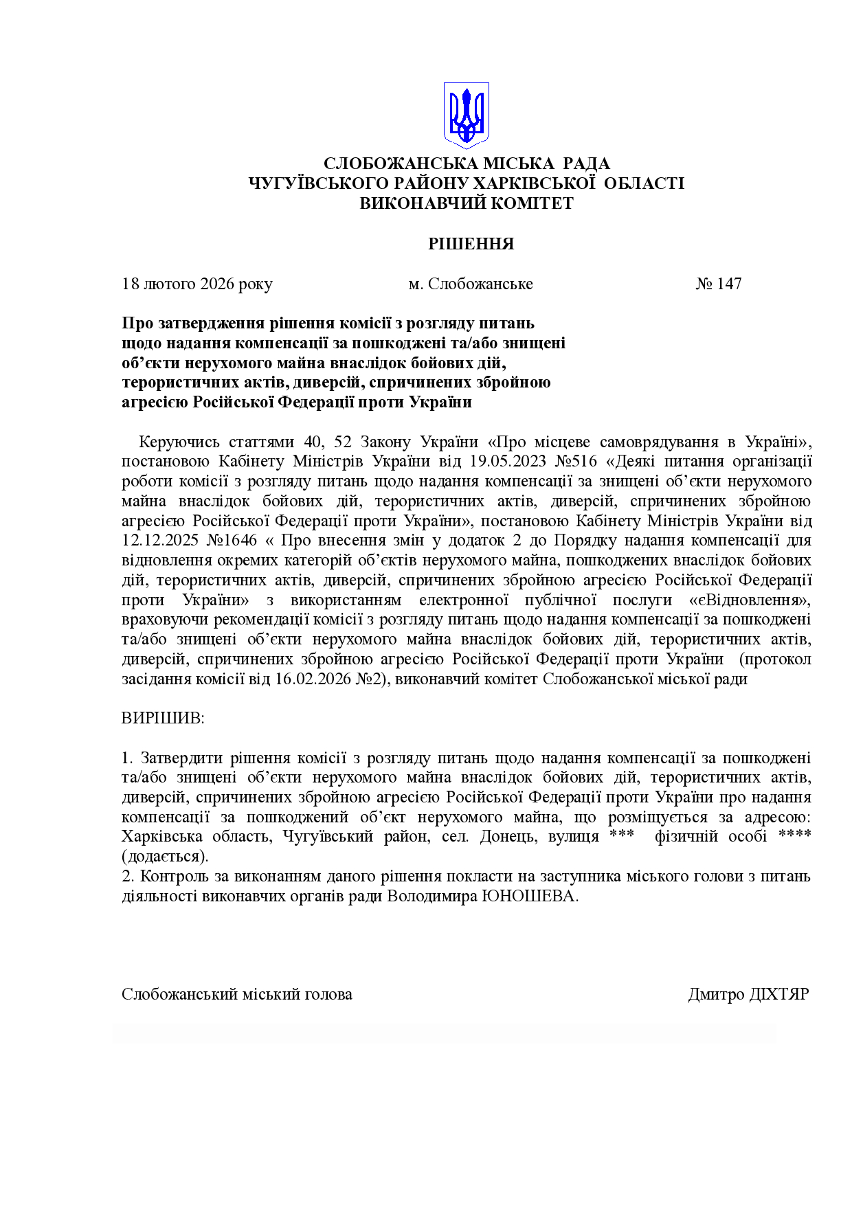 Рішення виконавчого комітету №147 Про затвердження рішення комісії з розгляду питань щодо надання компенсації за пошкоджені та/або знищені об’єкти нерухомого майна внаслідок бойових дій, терористичних актів, диверсій, спричинених збройною агресією Російської Федерації проти України.