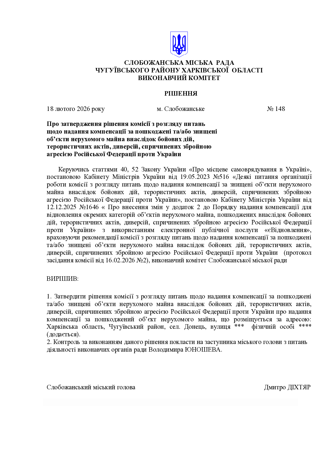 Рішення виконавчого комітету №148 Про затвердження рішення комісії з розгляду питань щодо надання компенсації за пошкоджені та/або знищені об’єкти нерухомого майна внаслідок бойових дій, терористичних актів, диверсій, спричинених збройною агресією Російської Федерації проти України.