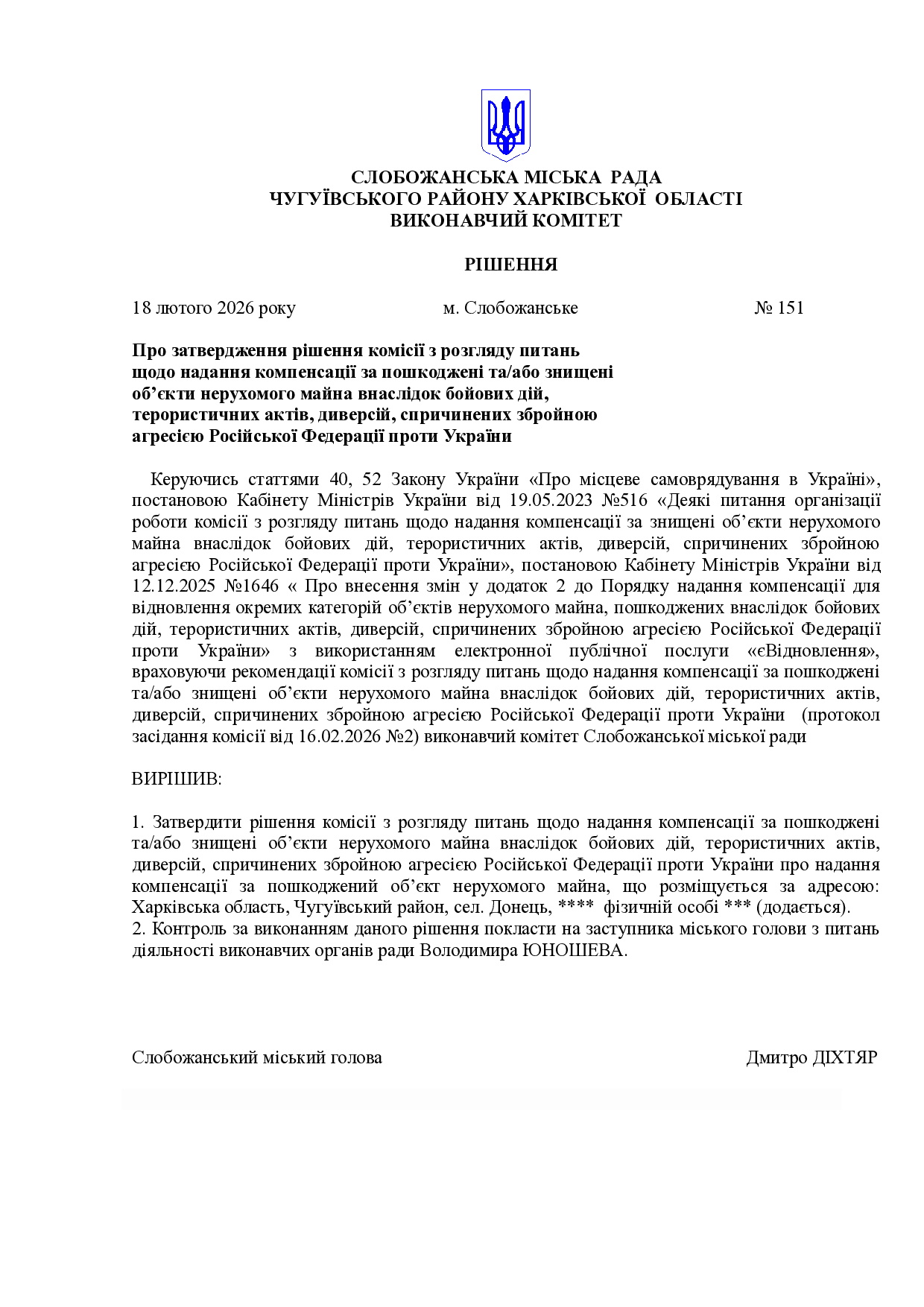 Рішення виконавчого комітету №151 Про затвердження рішення комісії з розгляду питань щодо надання компенсації за пошкоджені та/або знищені об’єкти нерухомого майна внаслідок бойових дій, терористичних актів, диверсій, спричинених збройною агресією Російської Федерації проти України.