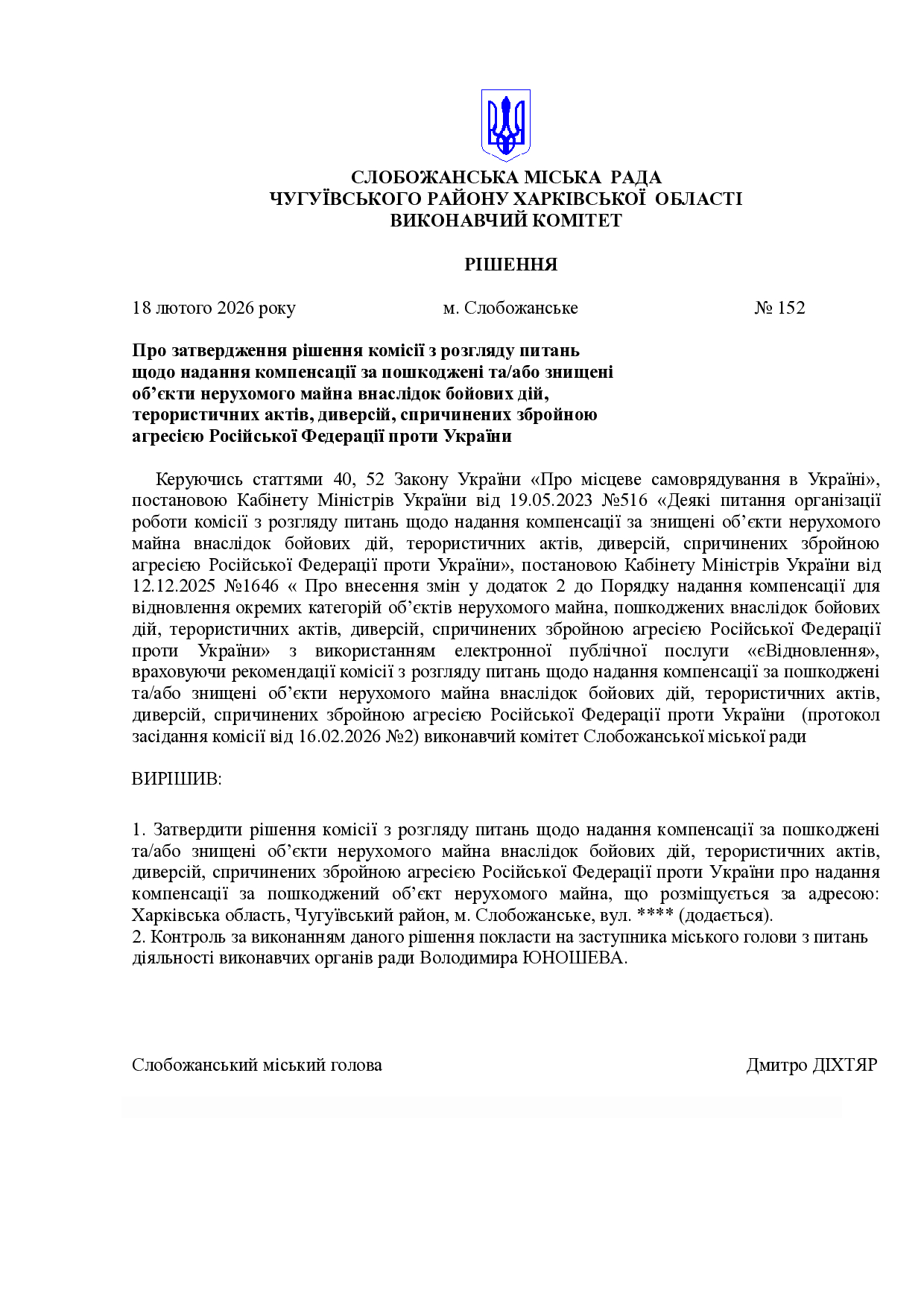 Рішення виконавчого комітету №152 Про затвердження рішення комісії з розгляду питань щодо надання компенсації за пошкоджені та/або знищені об’єкти нерухомого майна внаслідок бойових дій, терористичних актів, диверсій, спричинених збройною агресією Російської Федерації проти України.