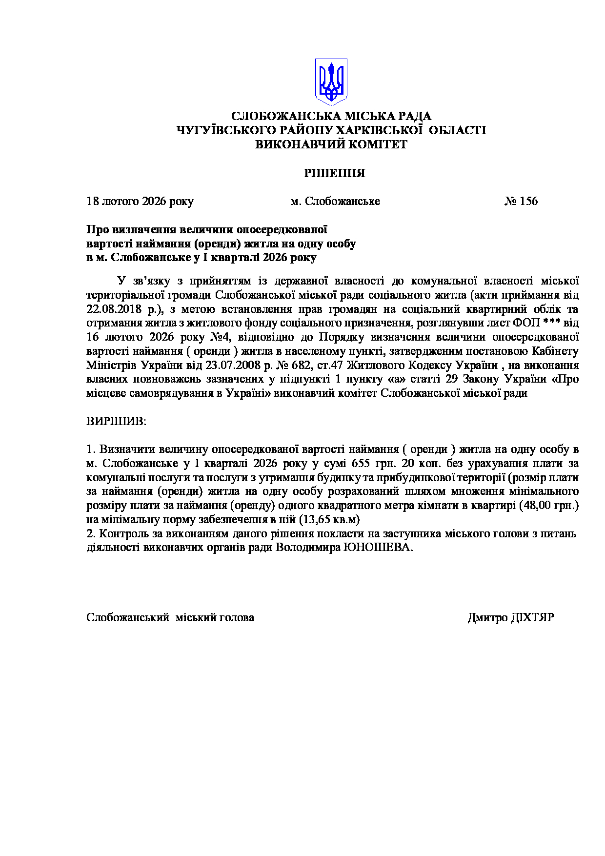 Рішення виконавчого комітету №156 Про визначення величини опосередкованої вартості наймання (оренди) житла на одну особу в м. Слобожанське у І кварталі 2026 року.