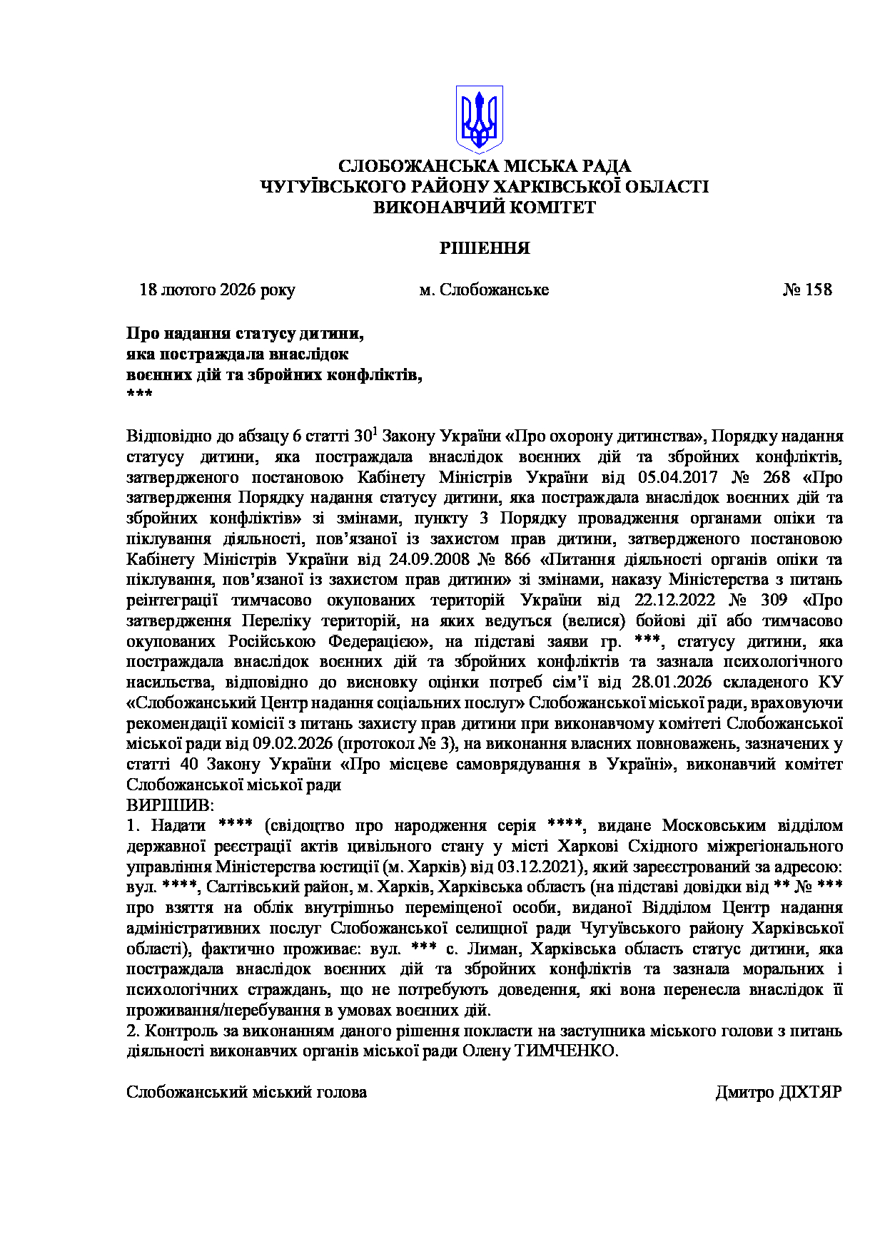 Рішення виконавчого комітету №158 Про надання статусу дитини, яка постраждала внаслідок воєнних дій та збройних конфліктів, ***