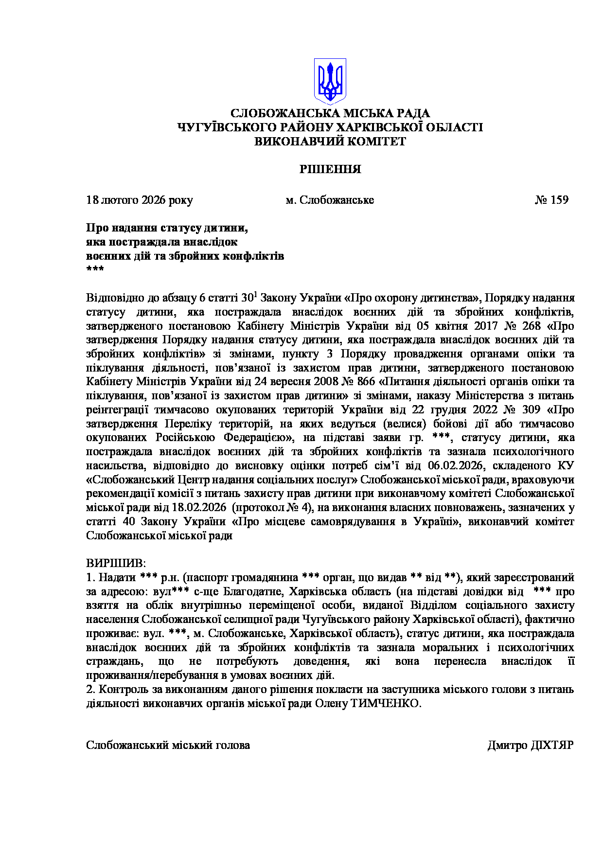 Рішення виконавчого комітету №159 Про надання статусу дитини, яка постраждала внаслідок воєнних дій та збройних конфліктів, ***