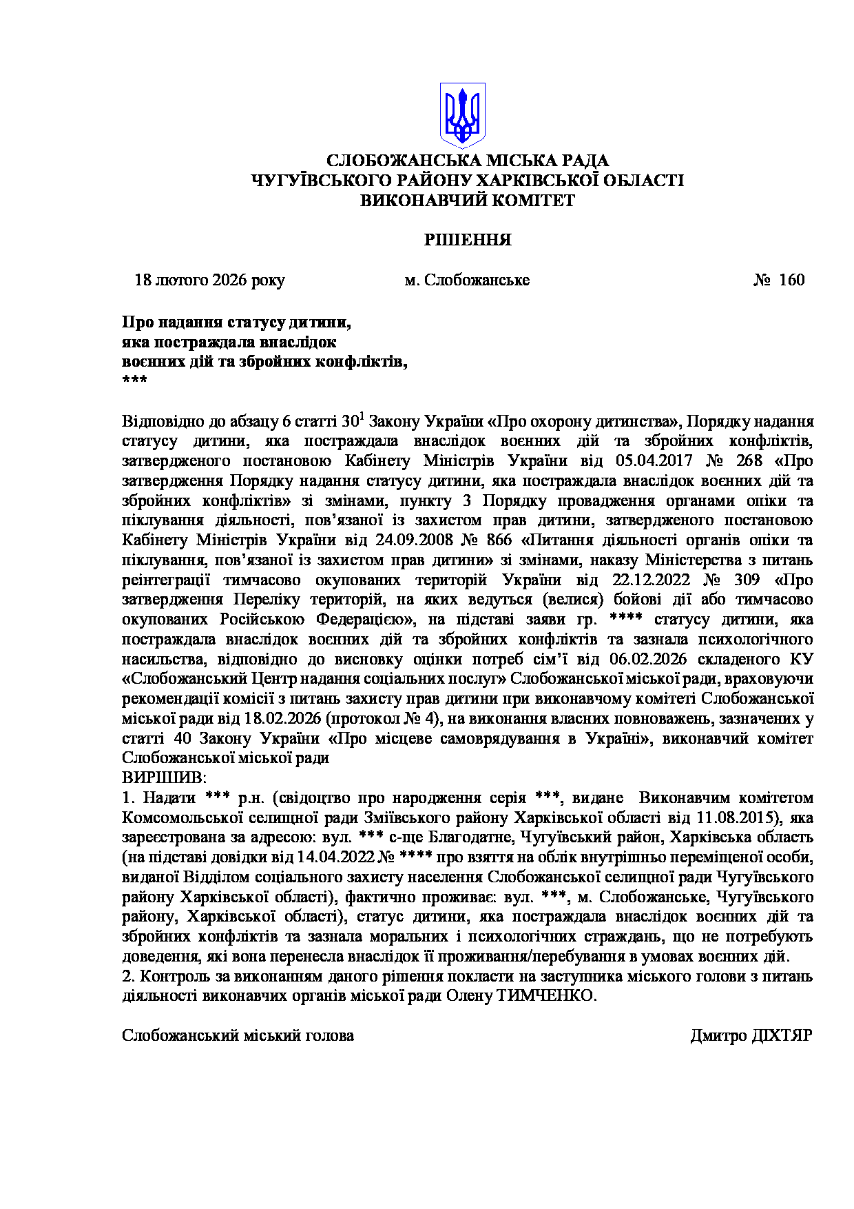 Рішення виконавчого комітету №160 Про надання статусу дитини, яка постраждала внаслідок воєнних дій та збройних конфліктів, ***