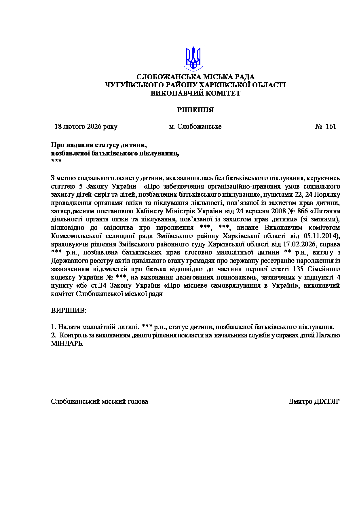 Рішення виконавчого комітету №161 Про надання статусу дитини, позбавленої батьківського піклування, ***