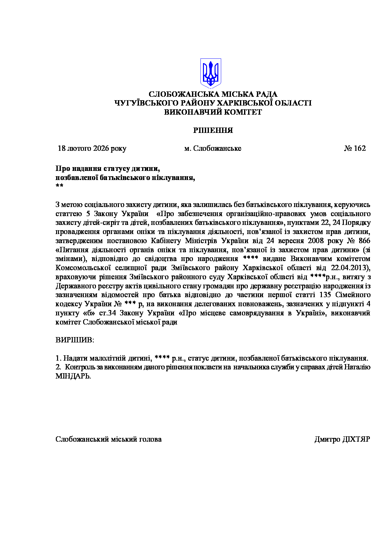 Рішення виконавчого комітету №162 Про надання статусу дитини, позбавленої батьківського піклування, ***