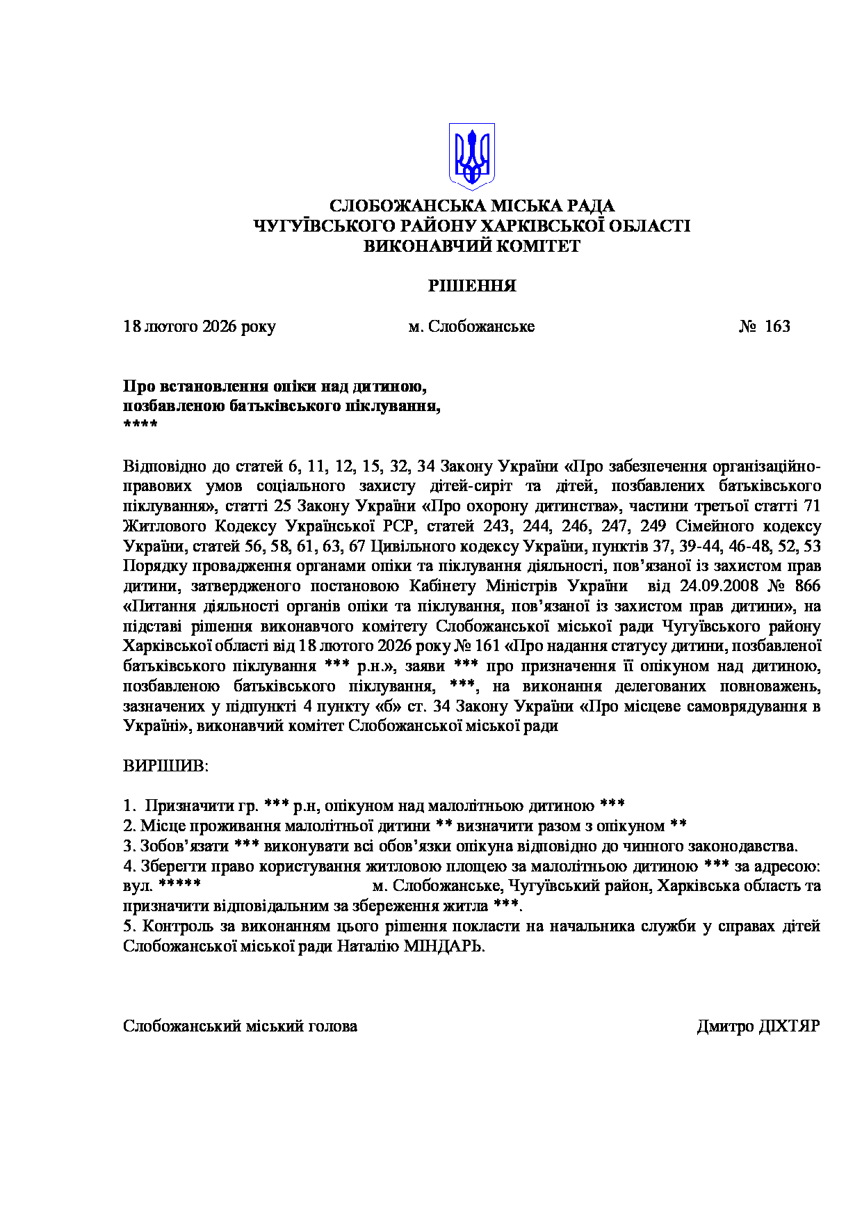Рішення виконавчого комітету №163 Про встановлення опіки над дитиною, позбавленою батьківського піклування, ***