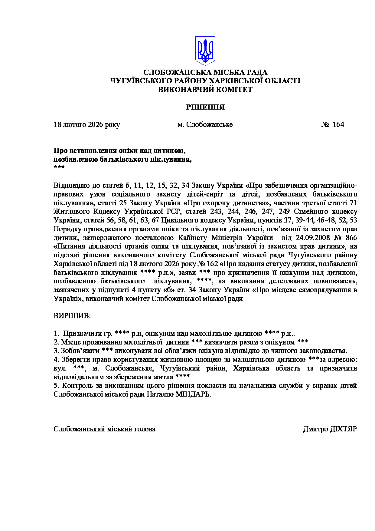 Рішення виконавчого комітету №164 Про встановлення опіки над дитиною, позбавленою батьківського піклування, ***