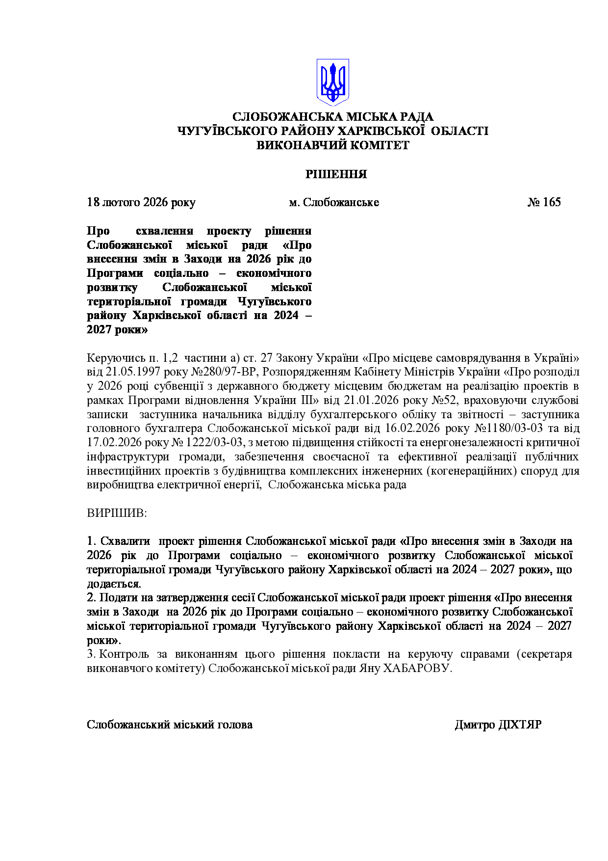 Рішення виконавчого комітету №165 Про схвалення проекту рішення Слобожанської міської ради «Про внесення змін в Заходи на 2026 рік до Програми соціально-економічного розвитку Слобожанської міської територіальної громади Чугуївського району Харківської області на 2024-2027 роки».