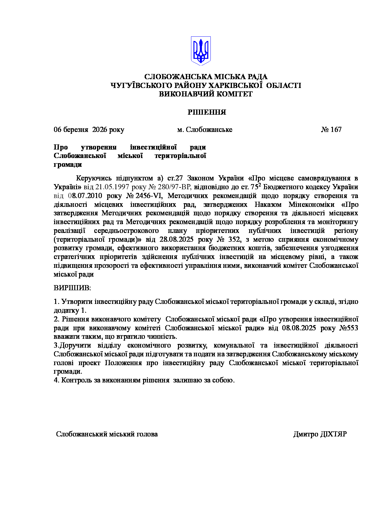 Рішення виконавчого комітету №167 Про утворення інвестиційної ради Слобожанської міської територіальної громади