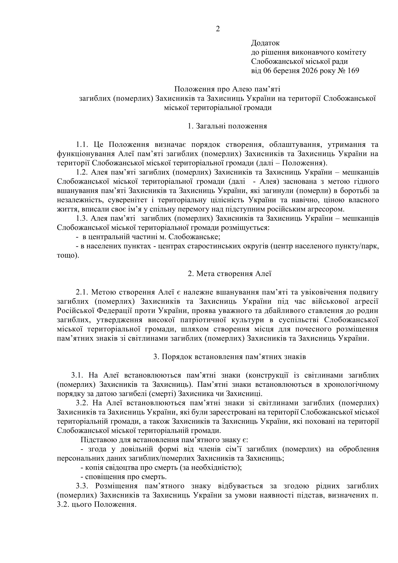 Рішення виконавчого комітету №169 Про затвердження Положення про Алею пам’яті загиблих (померлих) Захисників та Захисниць України на території Слобожанської міської територіальної громади.