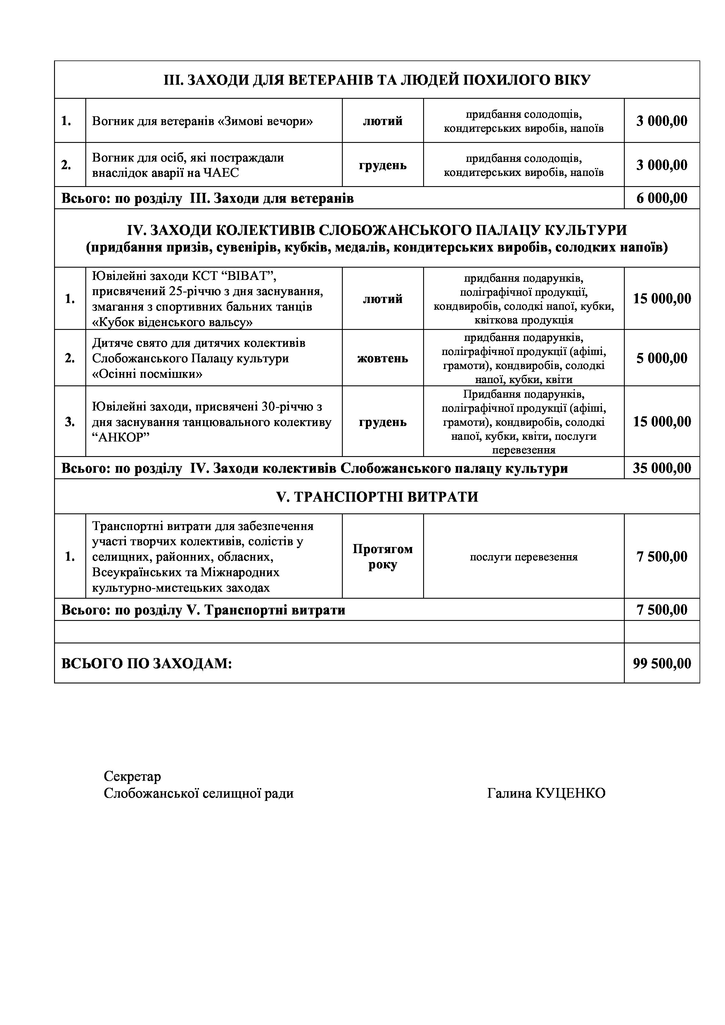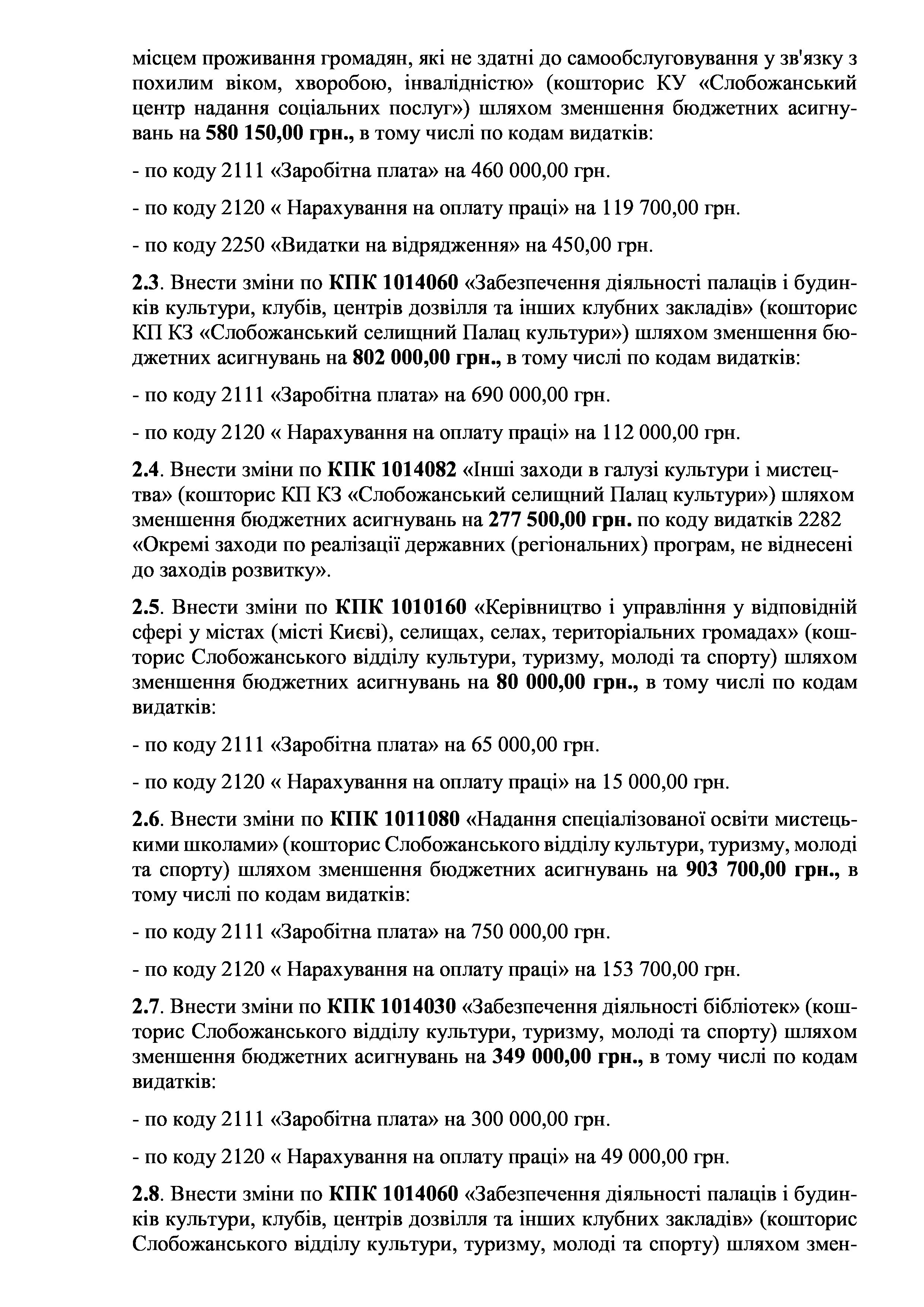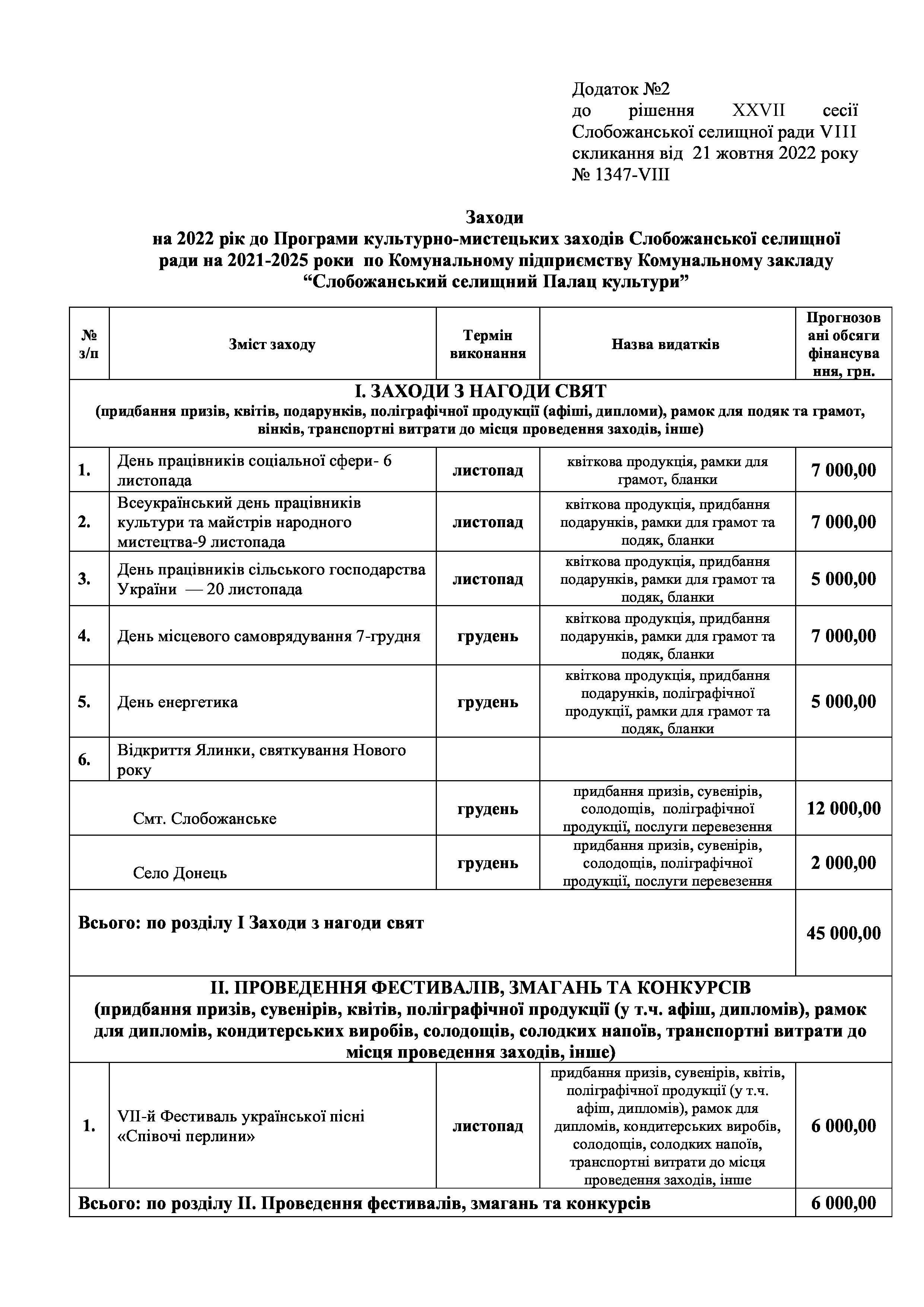Рішення сесії №1347-VIII Про внесення змін до Заходів на 2022 рік до Програми культурно – мистецьких заходів Слобожанської селищної ради на 2021 -2025 роки.