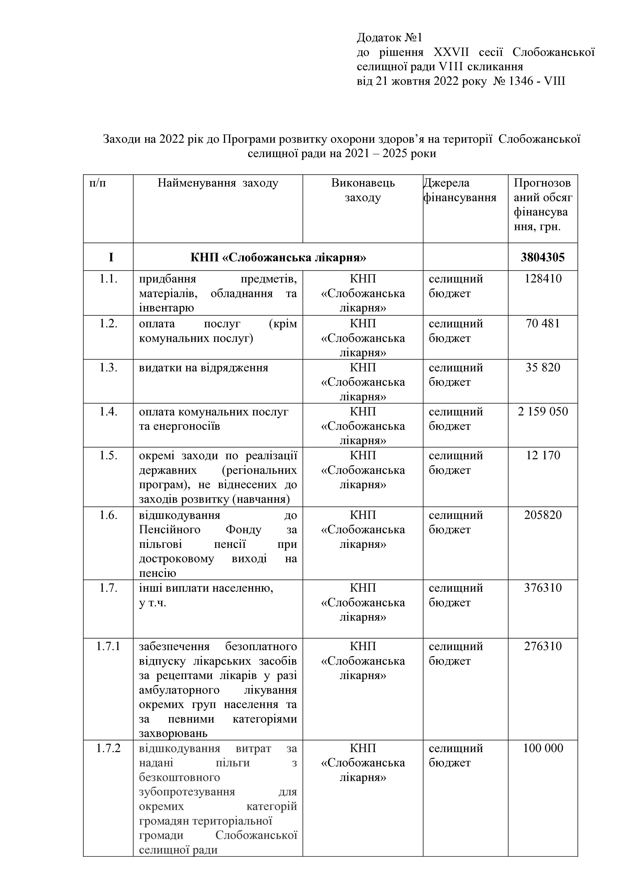 Рішення сесії №1346-VIII Про внесення змін до заходів на 2022 рік до Програми розвитку охорони здоров’я на території Слобожанської селищної ради на 2021 -2025 роки.