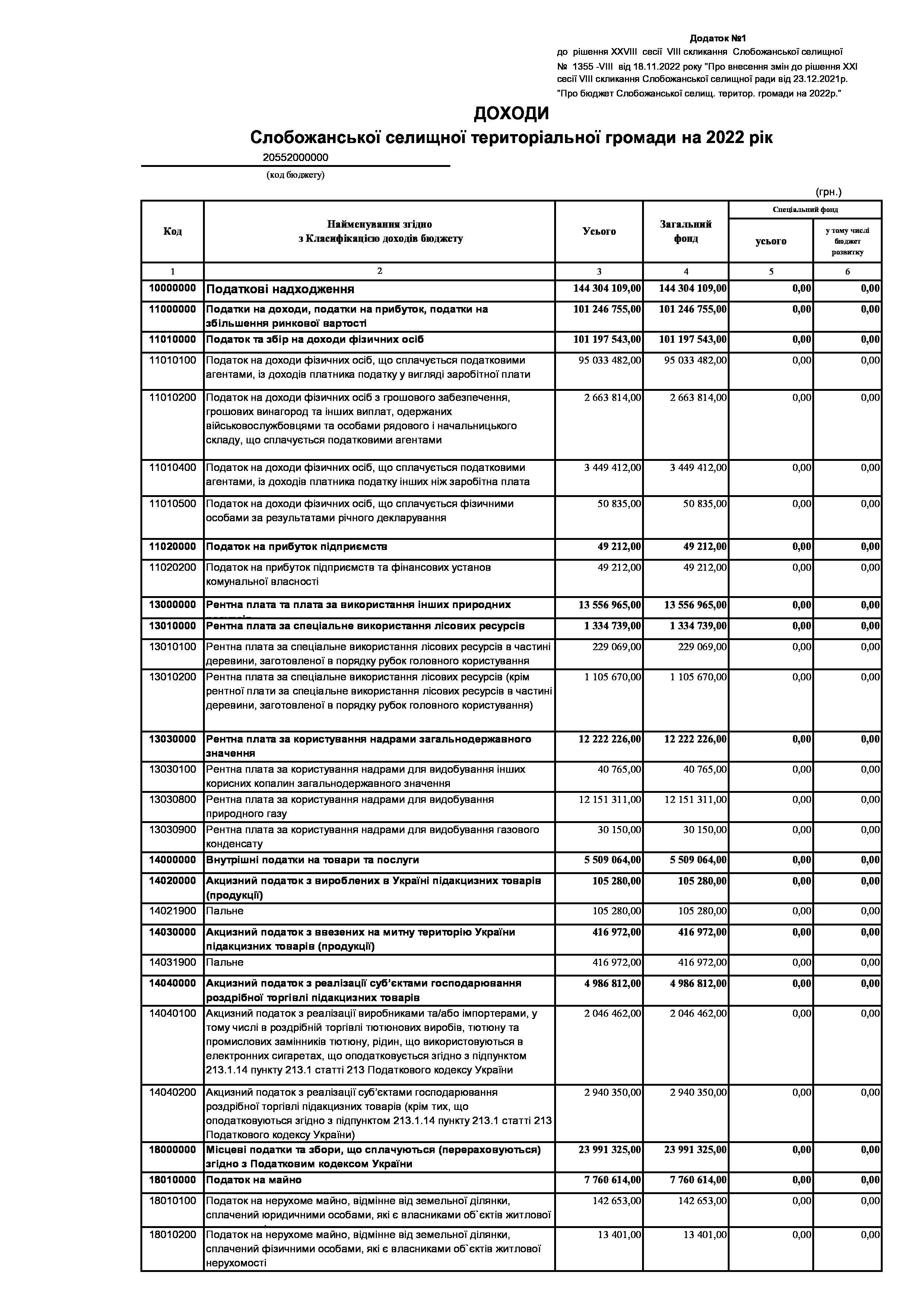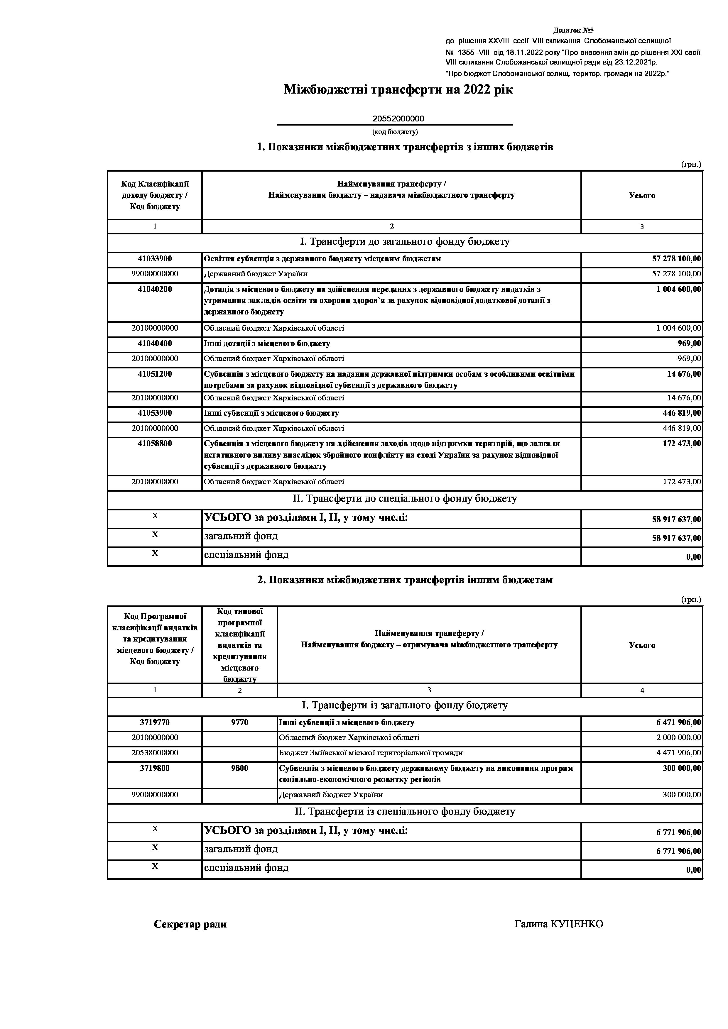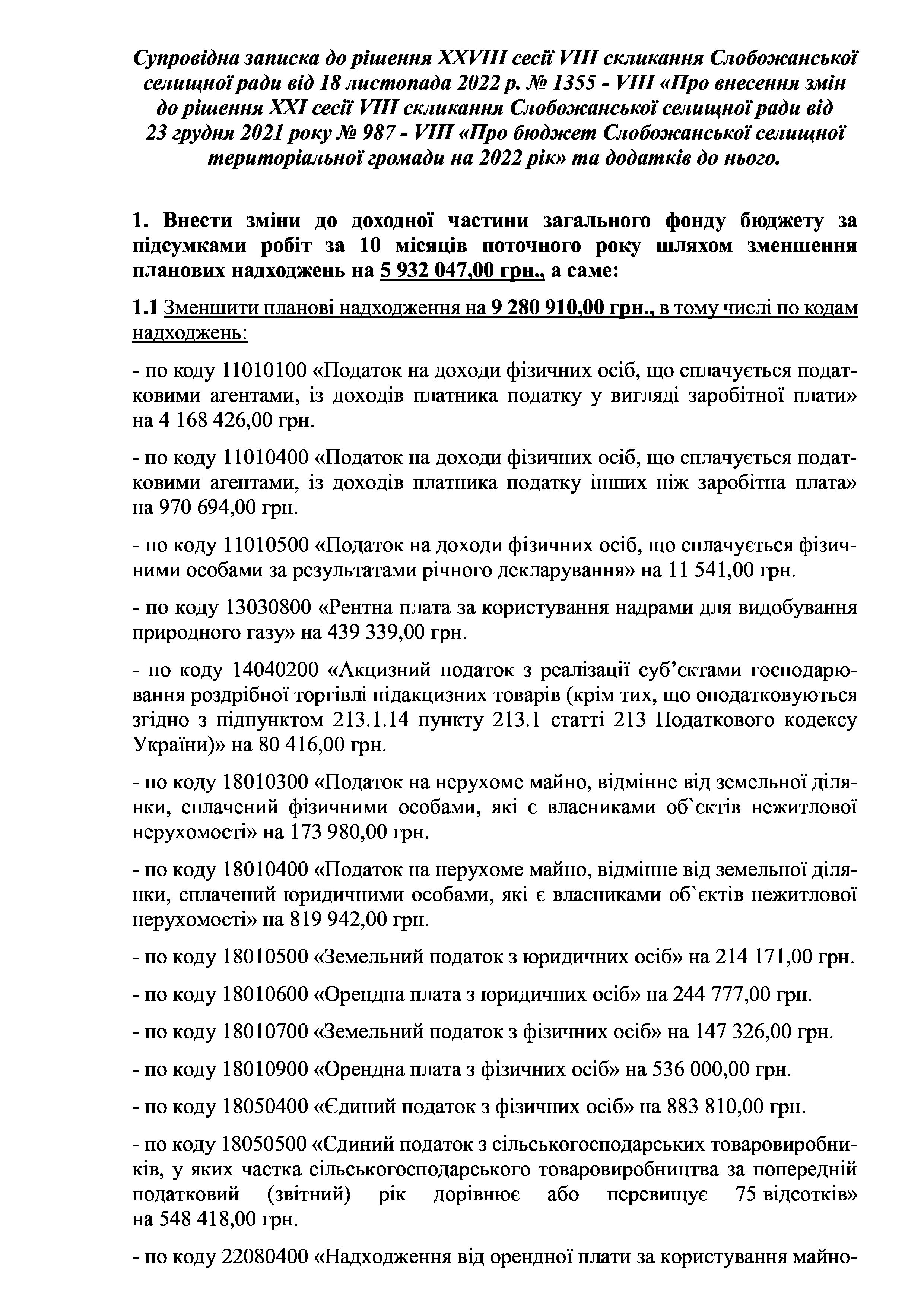Рішення сесії №1355-VIII Про внесення змін до рішення ХХІ сесії VIІI скликання Слобожанської селищної ради від 23 грудня 2021 року №987-VIІI «Про бюджет Слобожанської селищної територіальної громади на 2022 рік».