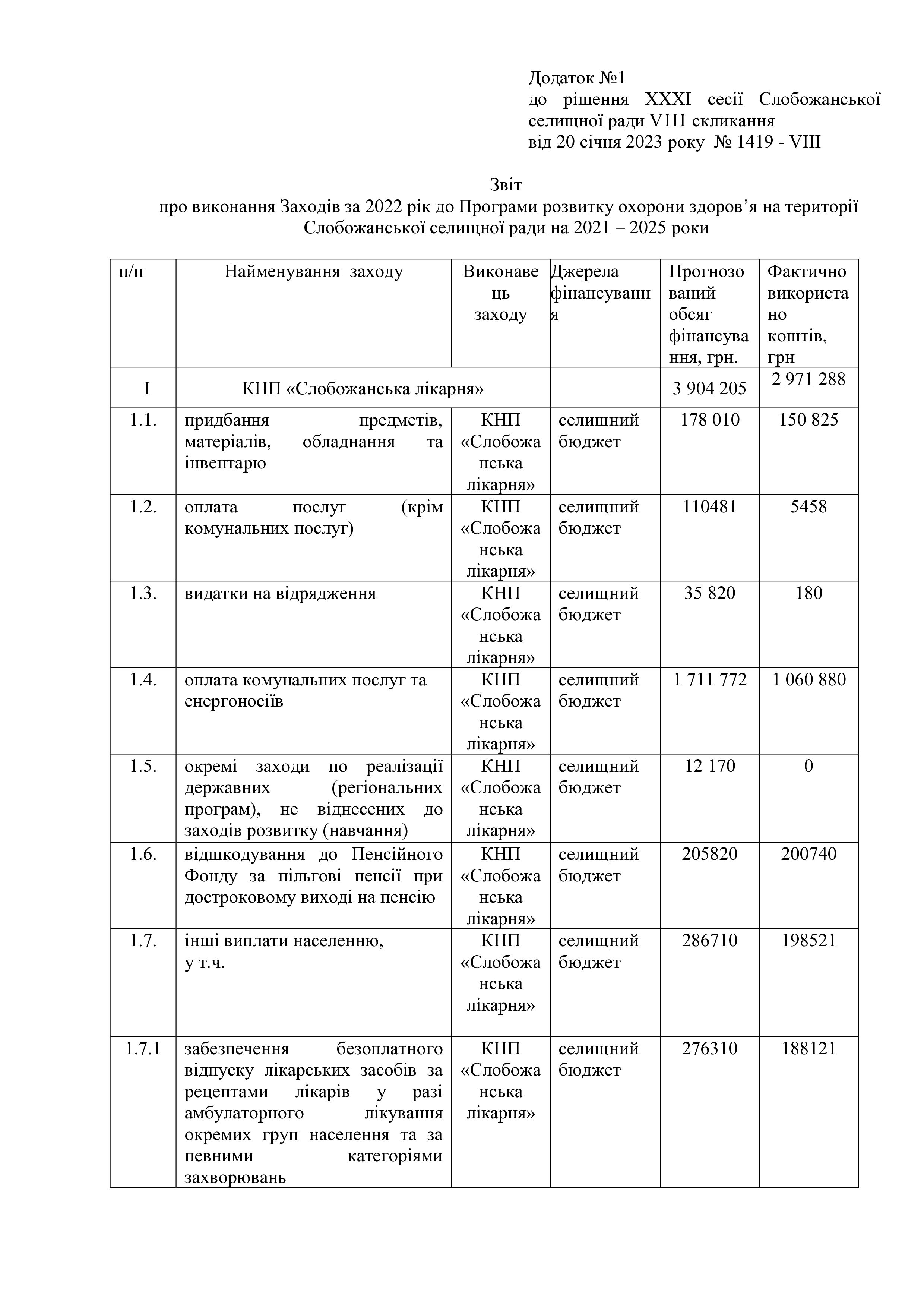 Рішення сесії №1419-VIII Про затвердження звіту про виконання заходів на 2022 рік до Програми розвитку охорони здоров’я на території Слобожанської селищної ради на 2021 -2025 роки.
