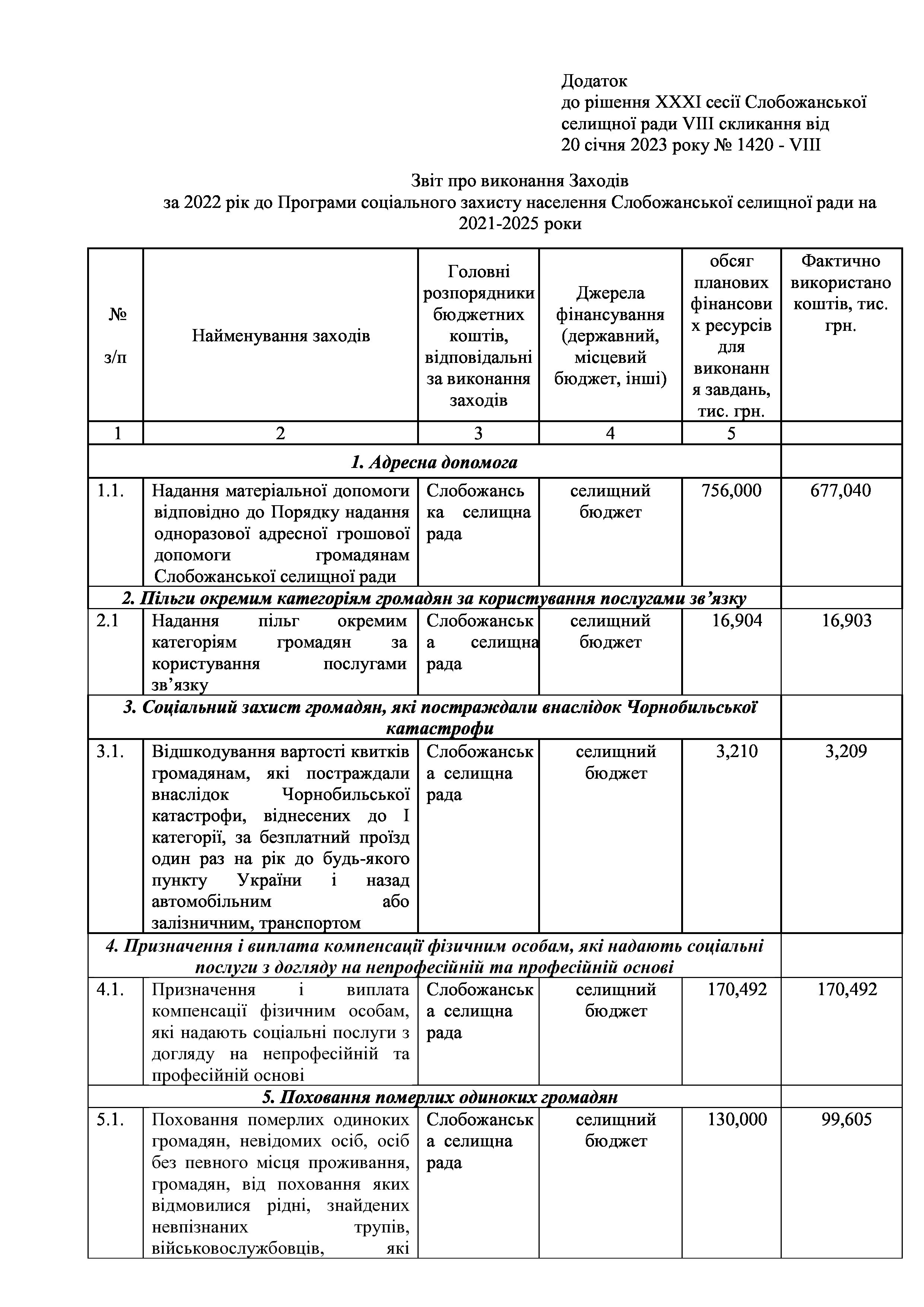 Рішення сесії №1420-VIII Про затвердження звіту про виконання Заходів за 2022 рік до Програми соціального захисту населення Слобожанської селищної ради на 2021-2025 роки.