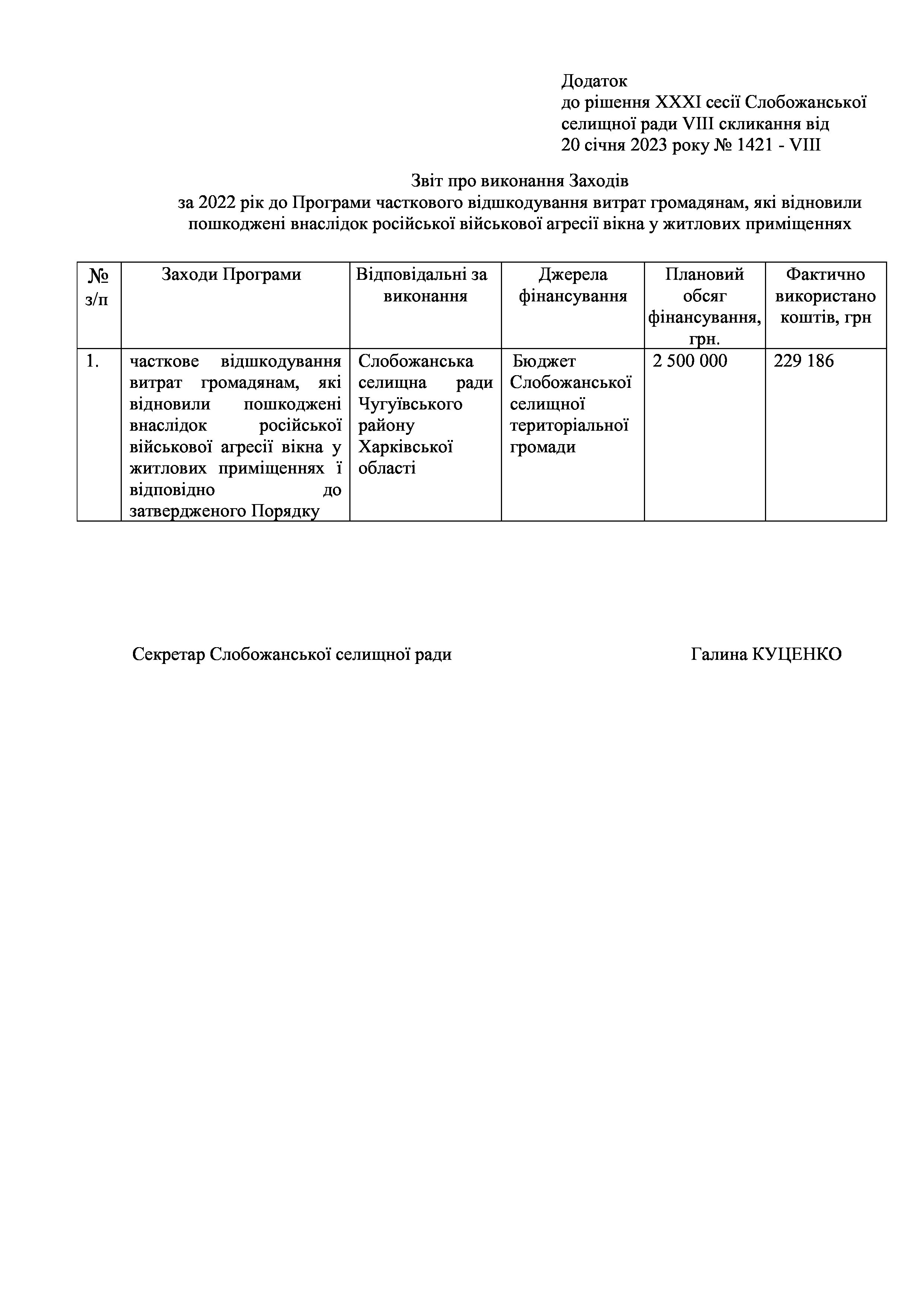Рішення сесії №1421-VIII Про затвердження звіту про виконання Заходів за 2022 рік до Програми часткового відшкодування витрат громадянам, які відновили пошкоджені внаслідок російської військової агресії вікна у житлових приміщеннях.