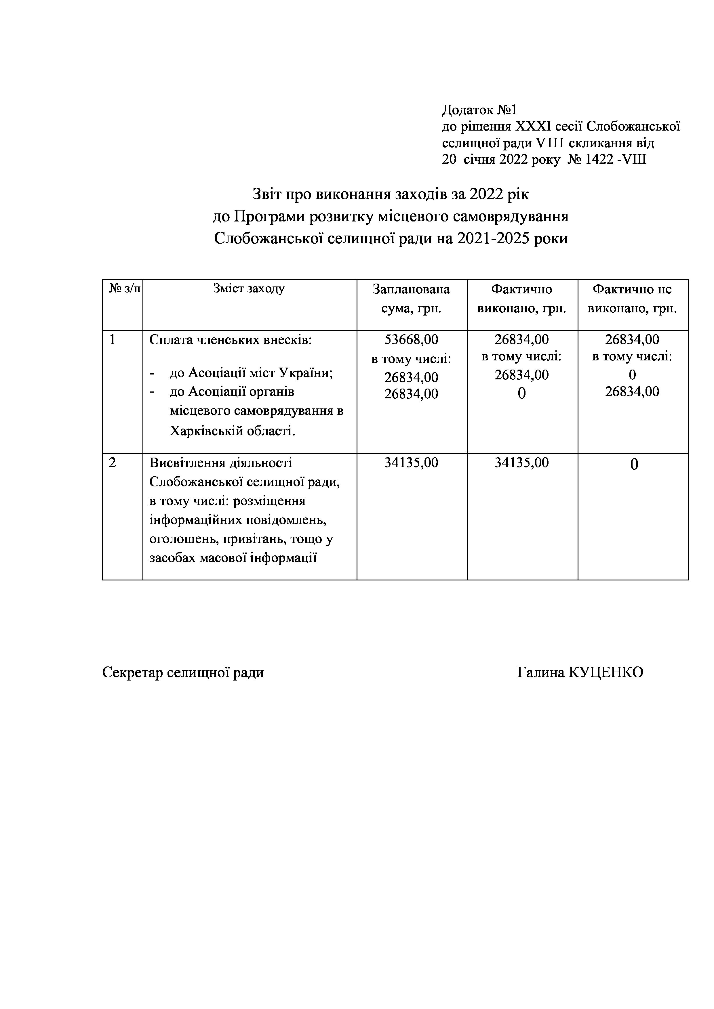 Рішення сесії №1422-VIII Про затвердження звіту про виконання заходів на 2022 рік до Програми розвитку місцевого самоврядування Слобожанської селищної ради на 2021-2025 роки.