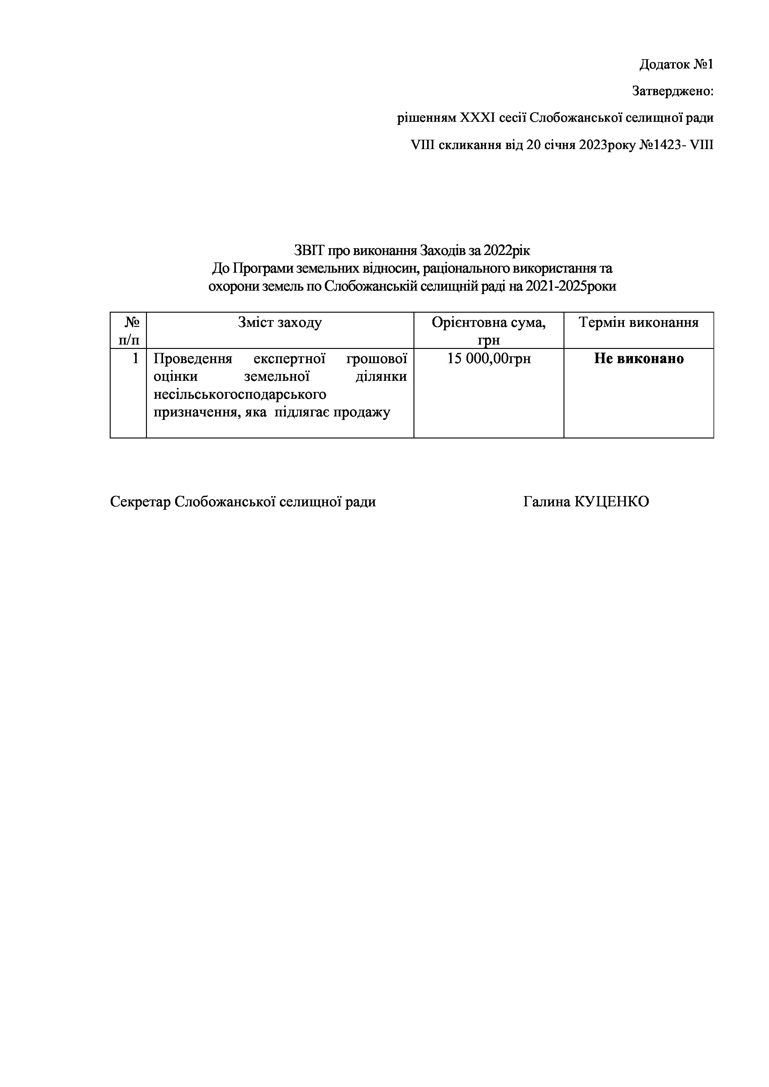 Рішення сесії №1423-VIII Про затвердження звіту про Заходи до Програми земельних відносин, раціонального використання та охорони земель по Слобожанській селищній раді на 2021-2025 роки.
