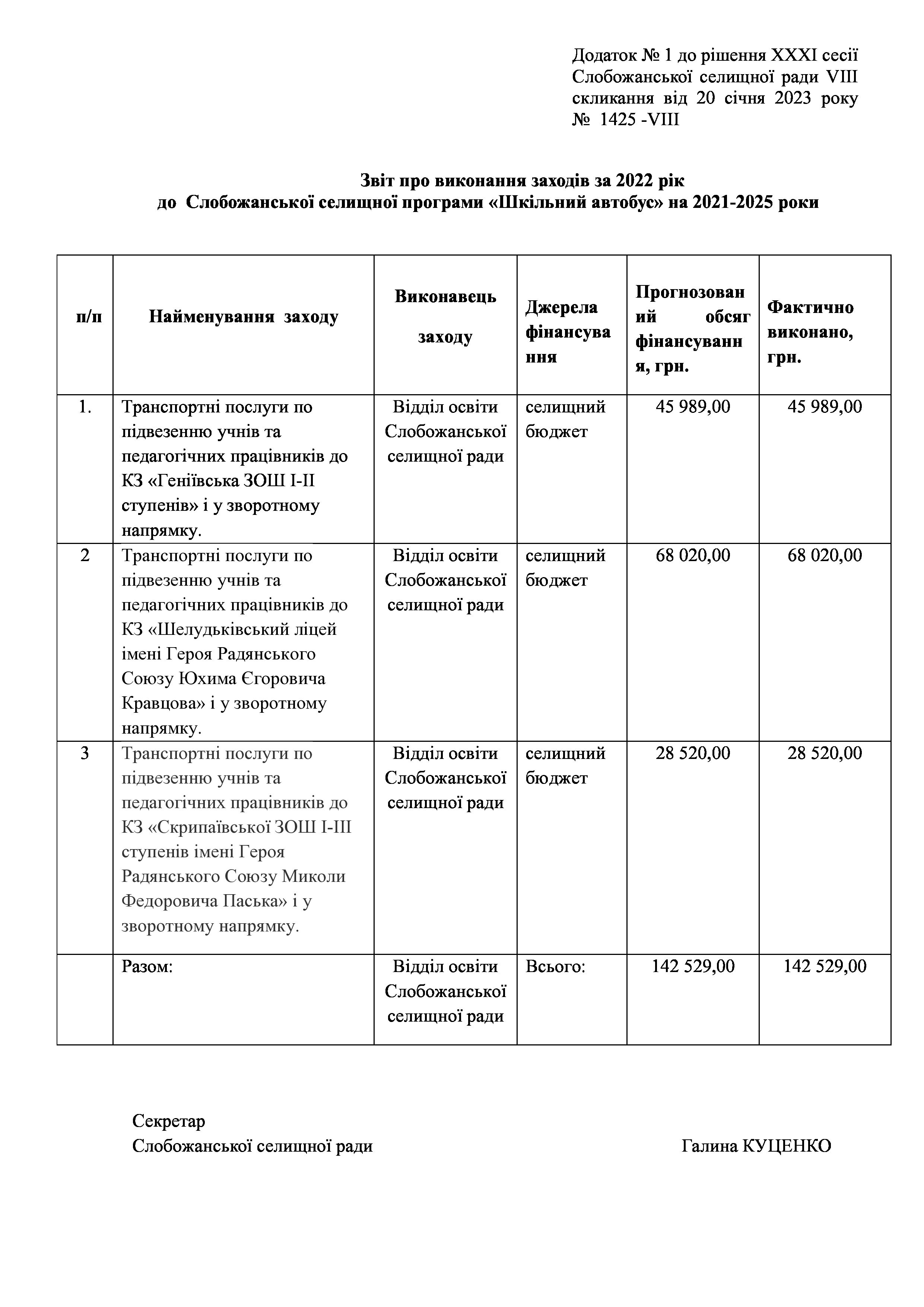 Рішення сесії №1425-VIII Про затвердження звіту про виконання Заходів за 2022 рік до Слобожанської селищної програми «Шкільний автобус» на 2021-2025 pоки.