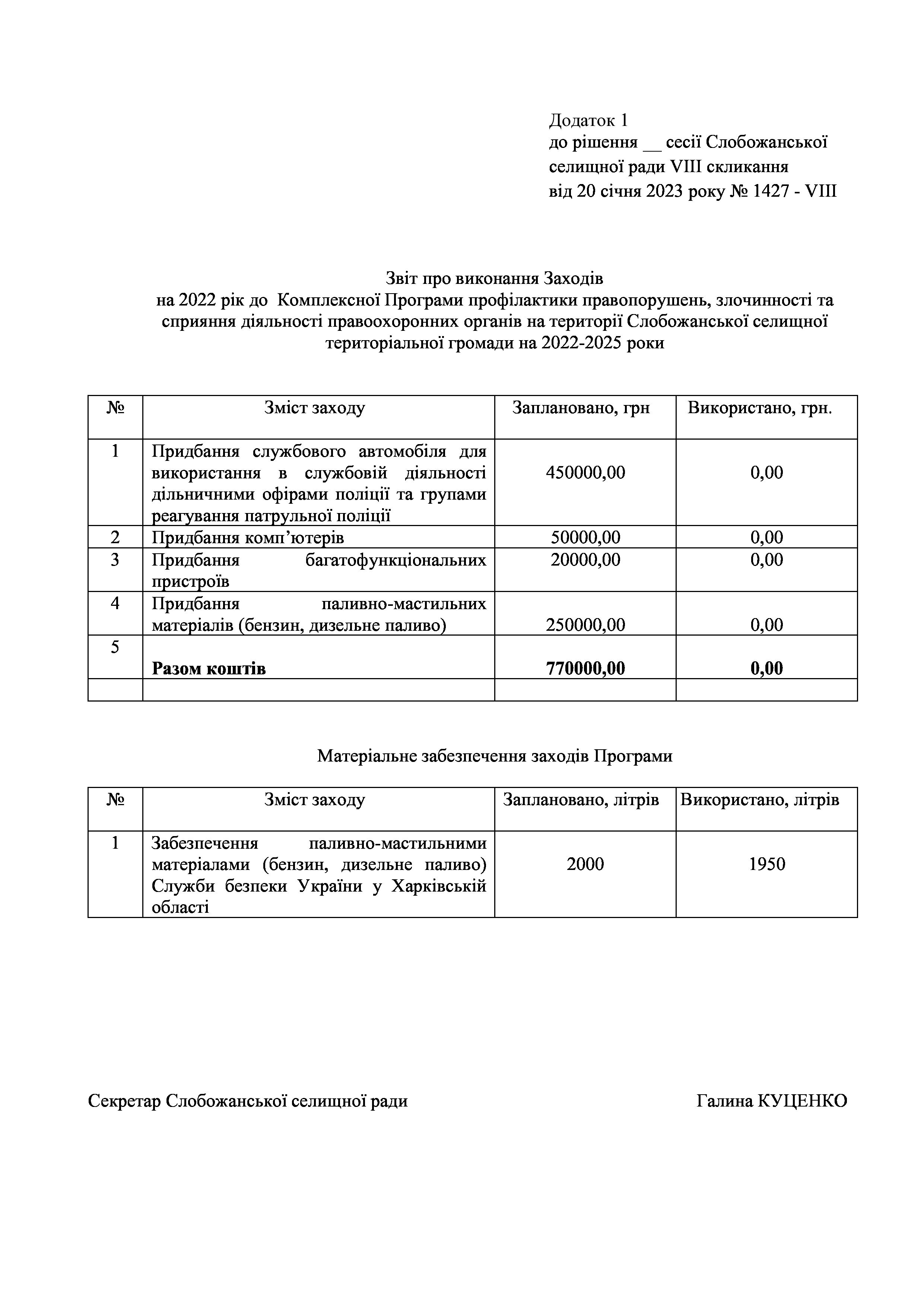 Рішення сесії №1427-VIII Про затвердження звіту про виконання Заходів на 2022 рік до Комплексної Програми профілактики правопорушень, злочинності та сприяння діяльності правоохоронних органів на території Слобожанської селищної територіальної громади 2022-2025 рр.