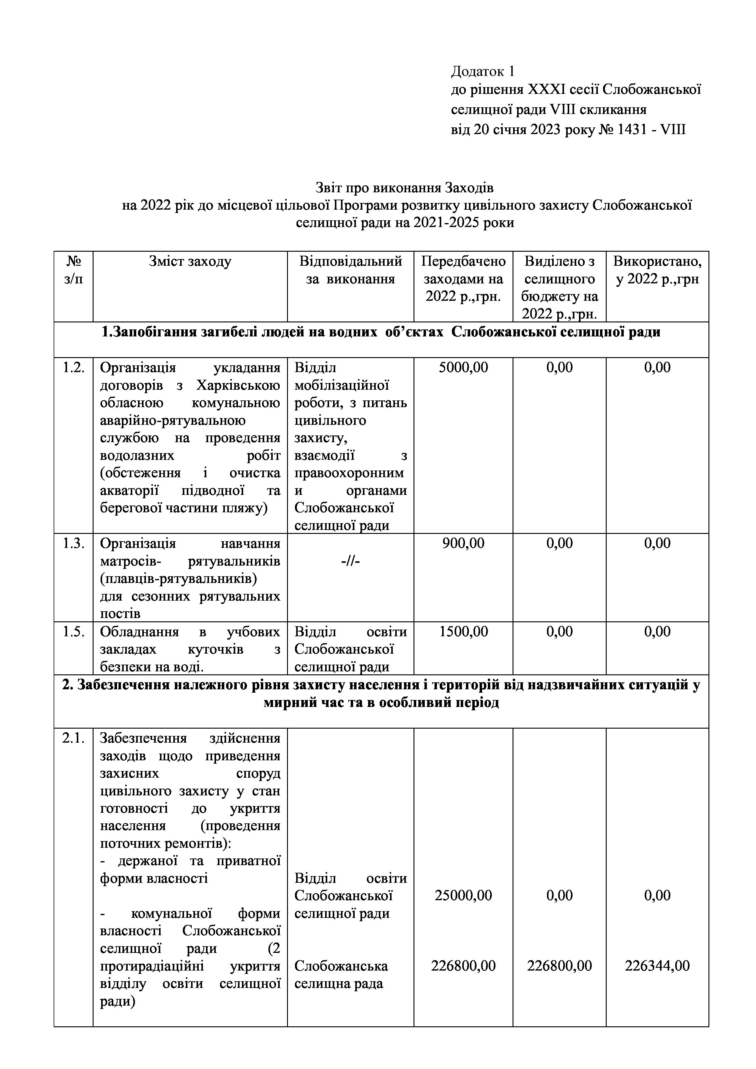 Рішення сесії №1431-VIII Про затвердження звіту про виконання Заходів на 2022 рік до місцевої цільової Програми розвитку цивільного захисту Слобожанської селищної ради на 2021-2025 роки.