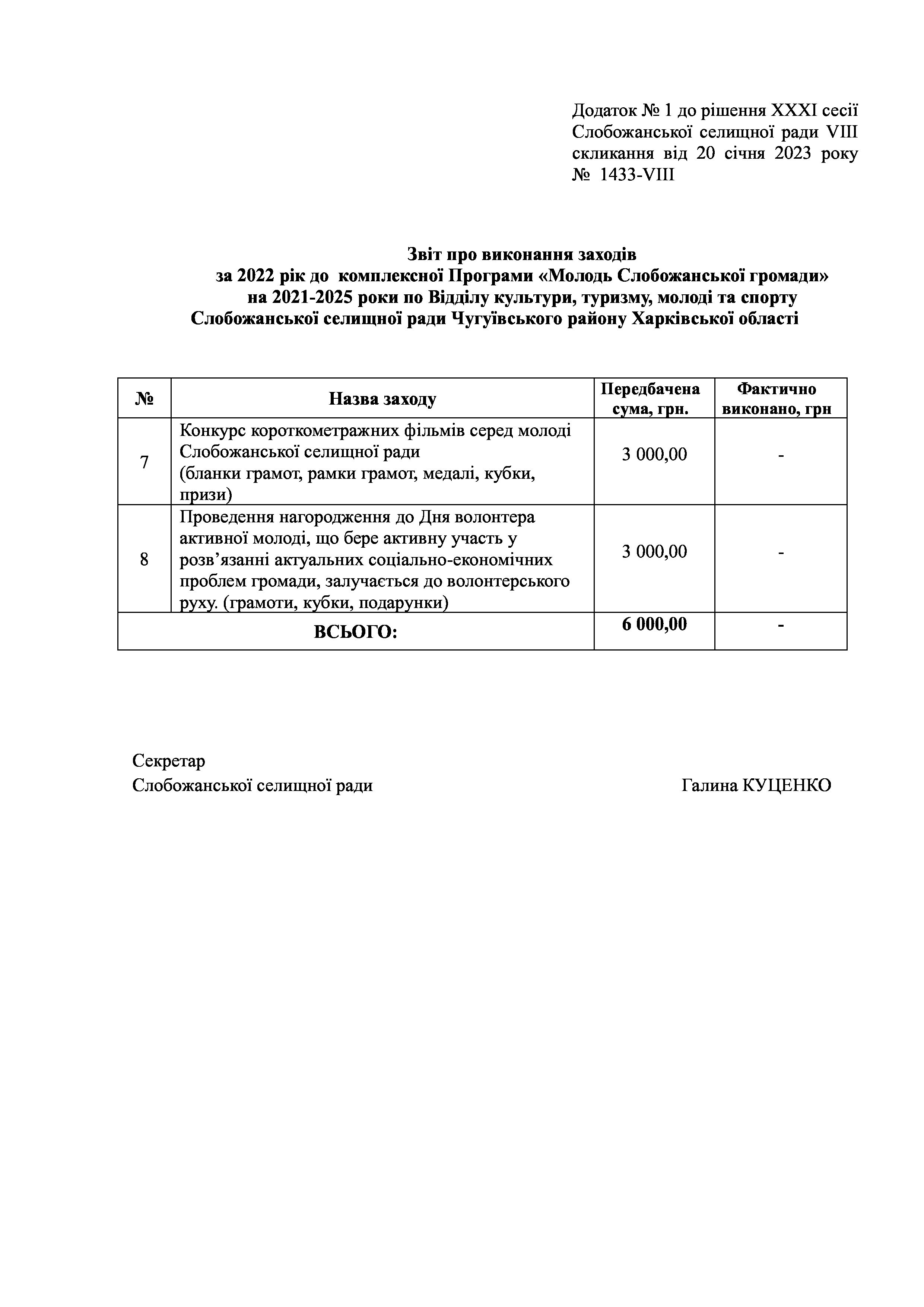 Рішення сесії №1433-VIII Про затвердження звіту про виконання заходів за 2022 рік до комплексної Програми “Молодь Слобожанської громади” на 2021-2025 роки.