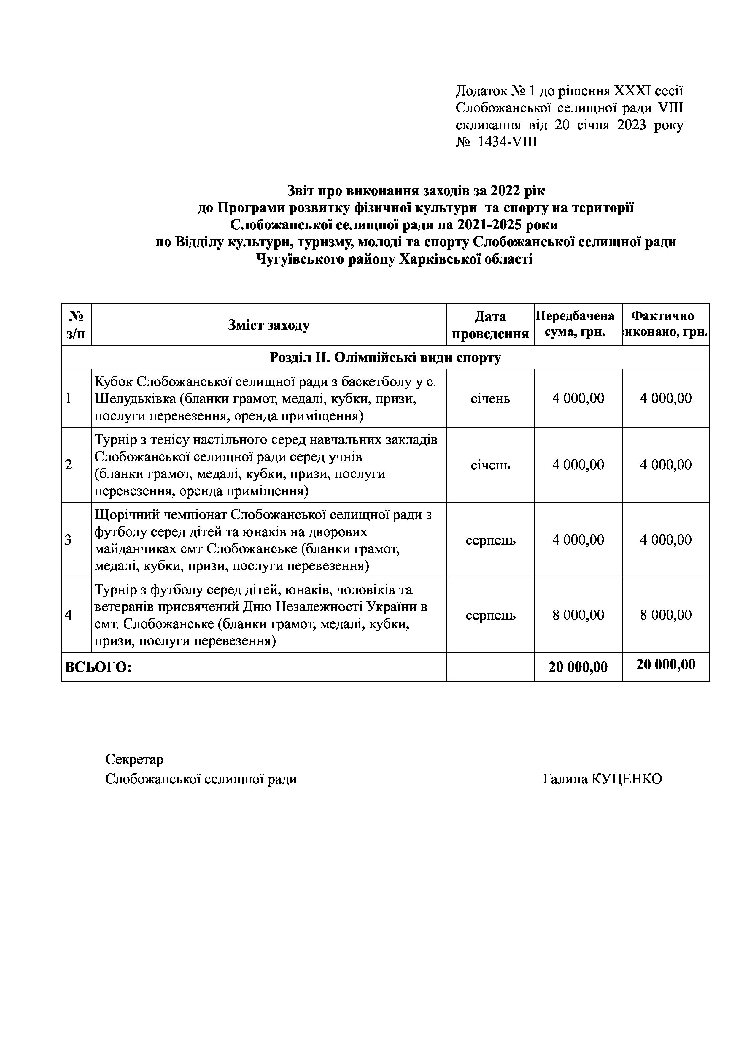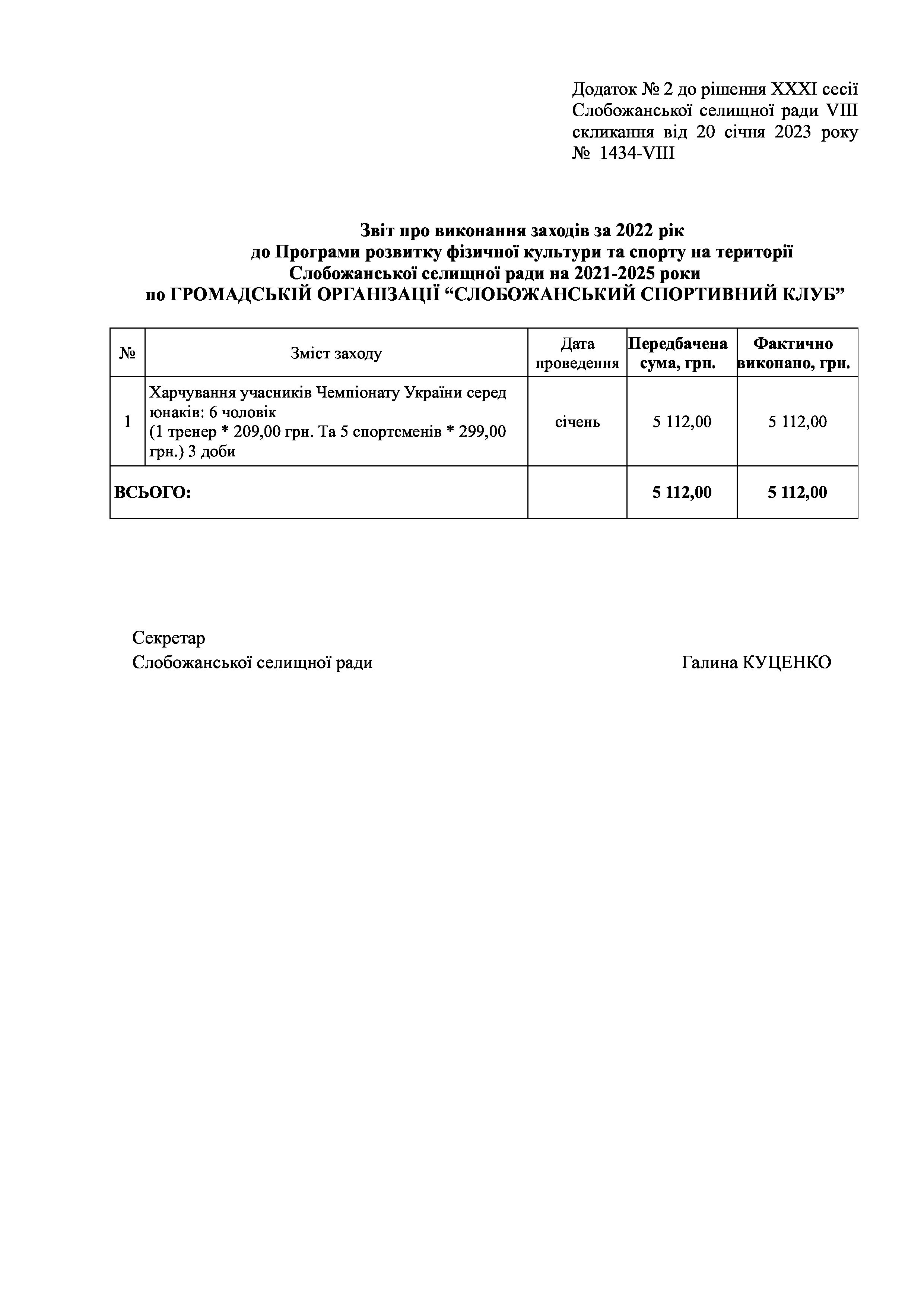 Рішення сесії №1434-VIII Про затвердження звіту про виконання заходів за 2022 рік до Програми розвитку фізичної культури та спорту на території Слобожанської селищної ради на 2021-2025 роки.