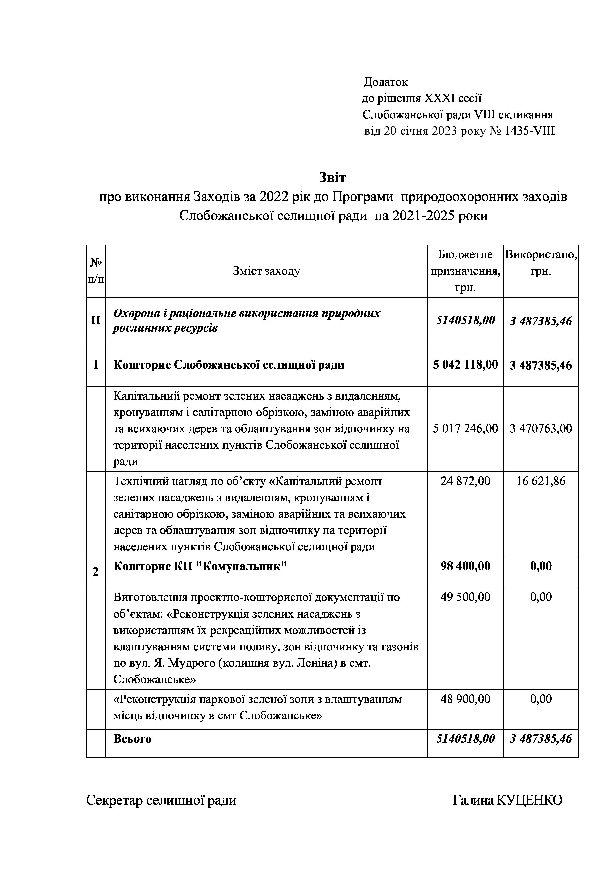 Рішення сесії №1435-VIII Про затвердження звіту про виконання заходів за 2022 рік до Програми природоохоронних заходів   Слобожанської селищної ради на 2021-2025 роки.