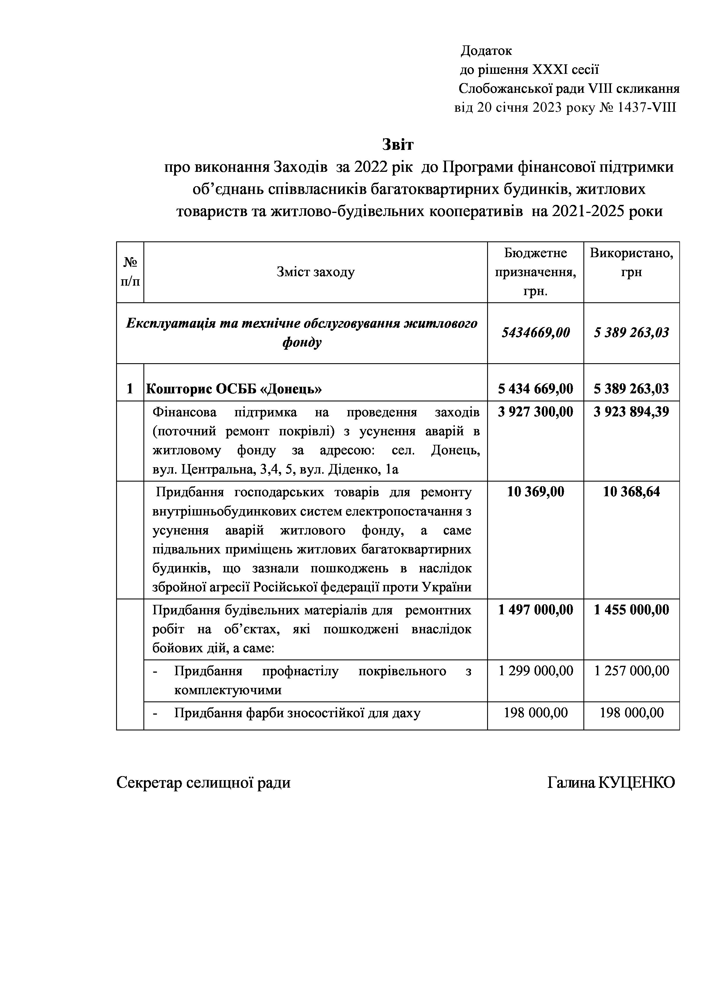 Рішення сесії №1437-VIII Про затвердження звіту про виконання Заходів за 2022 рік Програми фінансової підтримки об’єднань співвласників багатоквартирних будинків, житлових товариств та житлово-будівельних кооперативів на 2021-2025 роки.