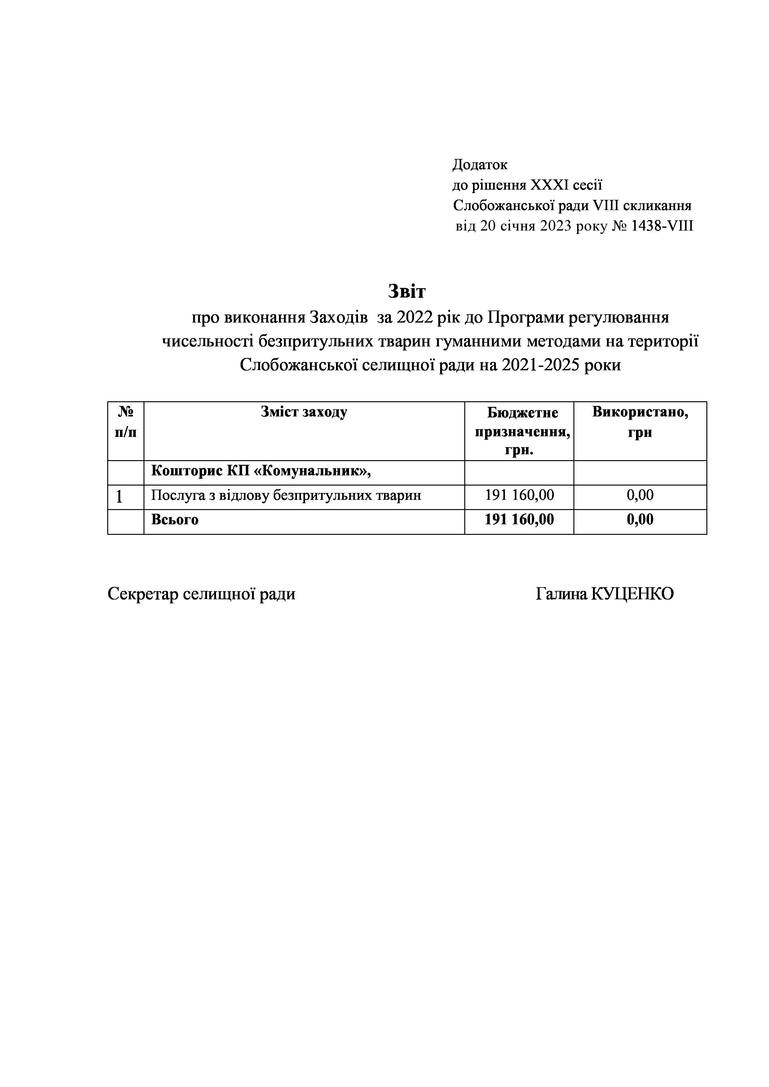 Рішення сесії №1438-VIII Про затвердження звіту про виконання Заходів за 2022 рік до Програми регулювання чисельності безпритульних тварин гуманними методами на території Слобожанської селищної ради на 2021-2025 роки.
