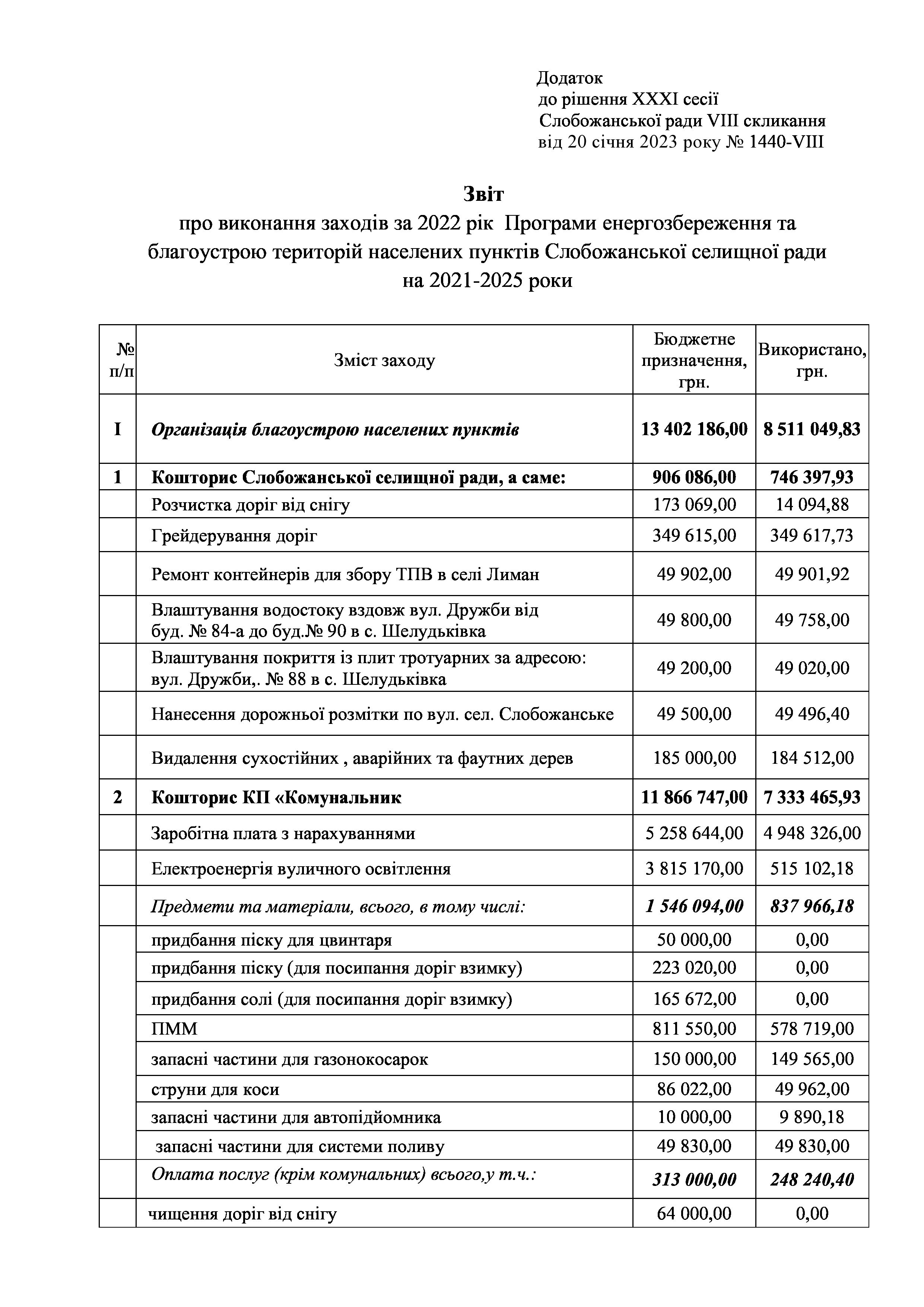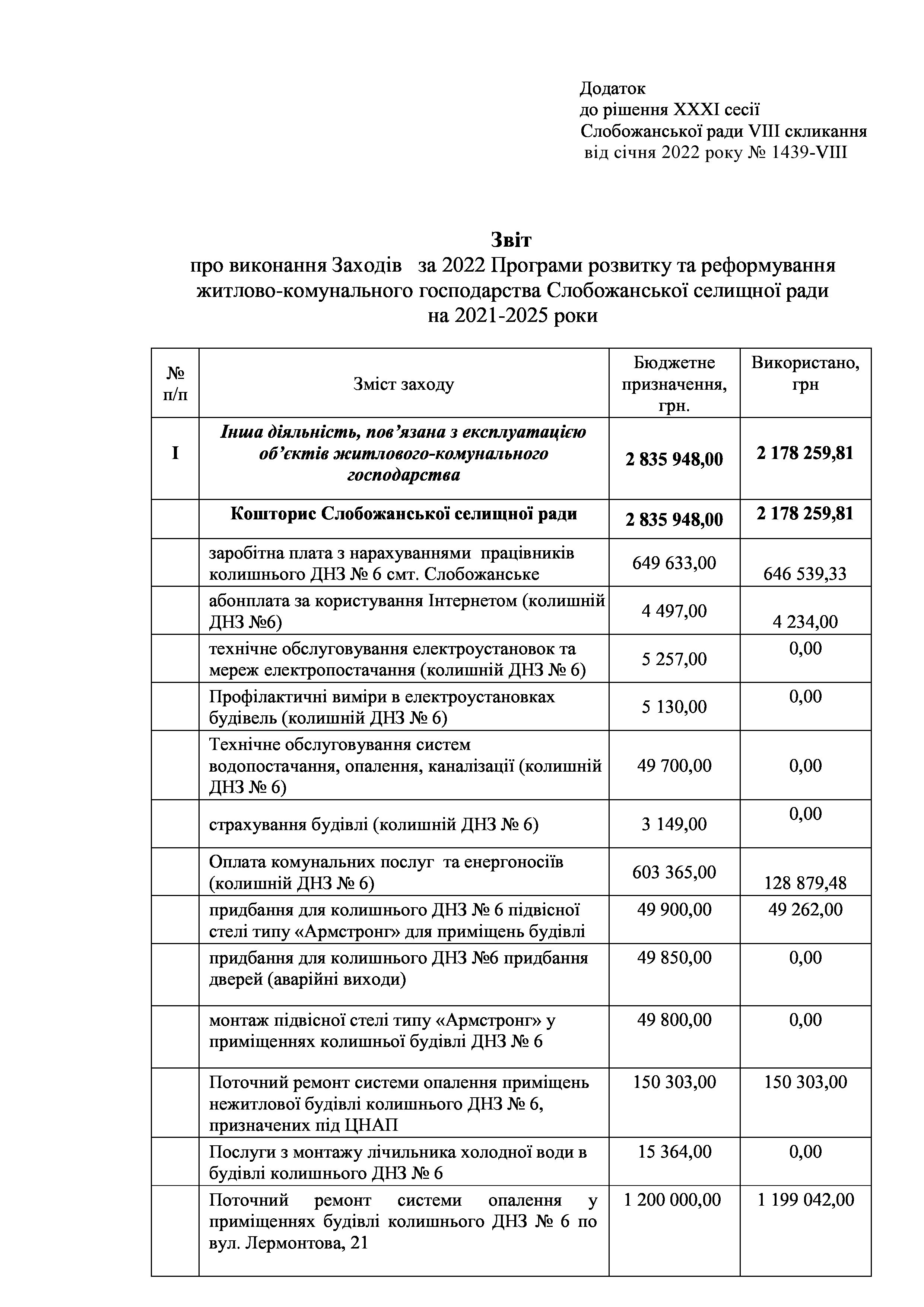 Рішення сесії №1439-VIII Про затвердження звіту про виконання заходів за 2022 рік до Програми розвитку та реформування житлово-комунального господарства Слобожанської селищної ради на 2021-2025 роки.