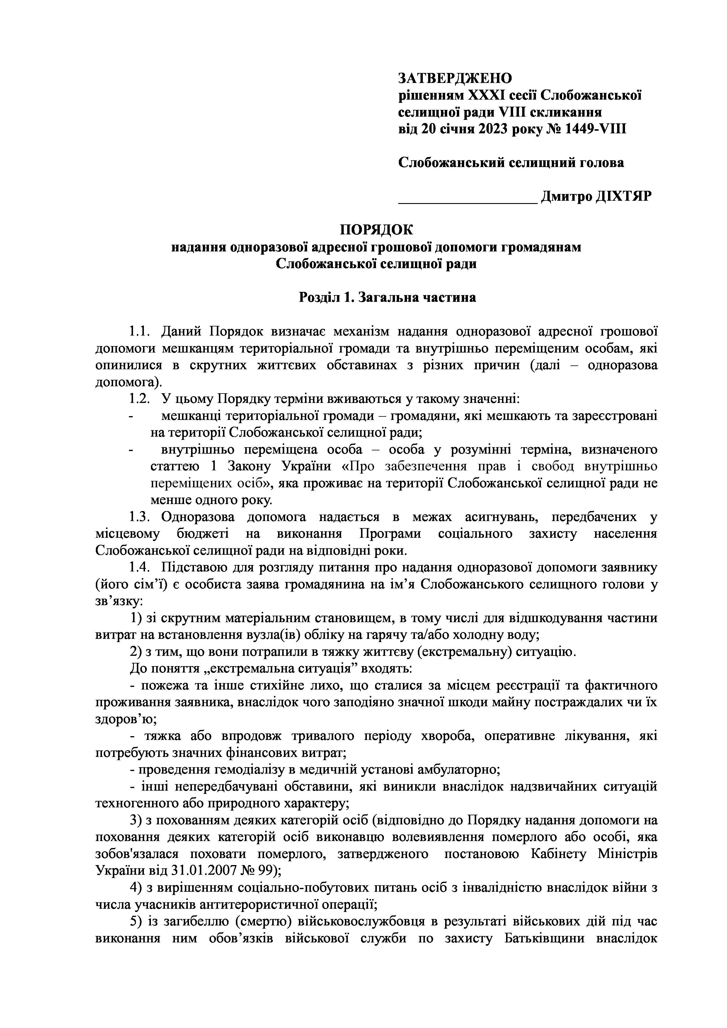 Рішення сесії №1449-VIII Про затвердження Порядку надання одноразової адресної грошової допомоги громадянам Слобожанської селищної ради.