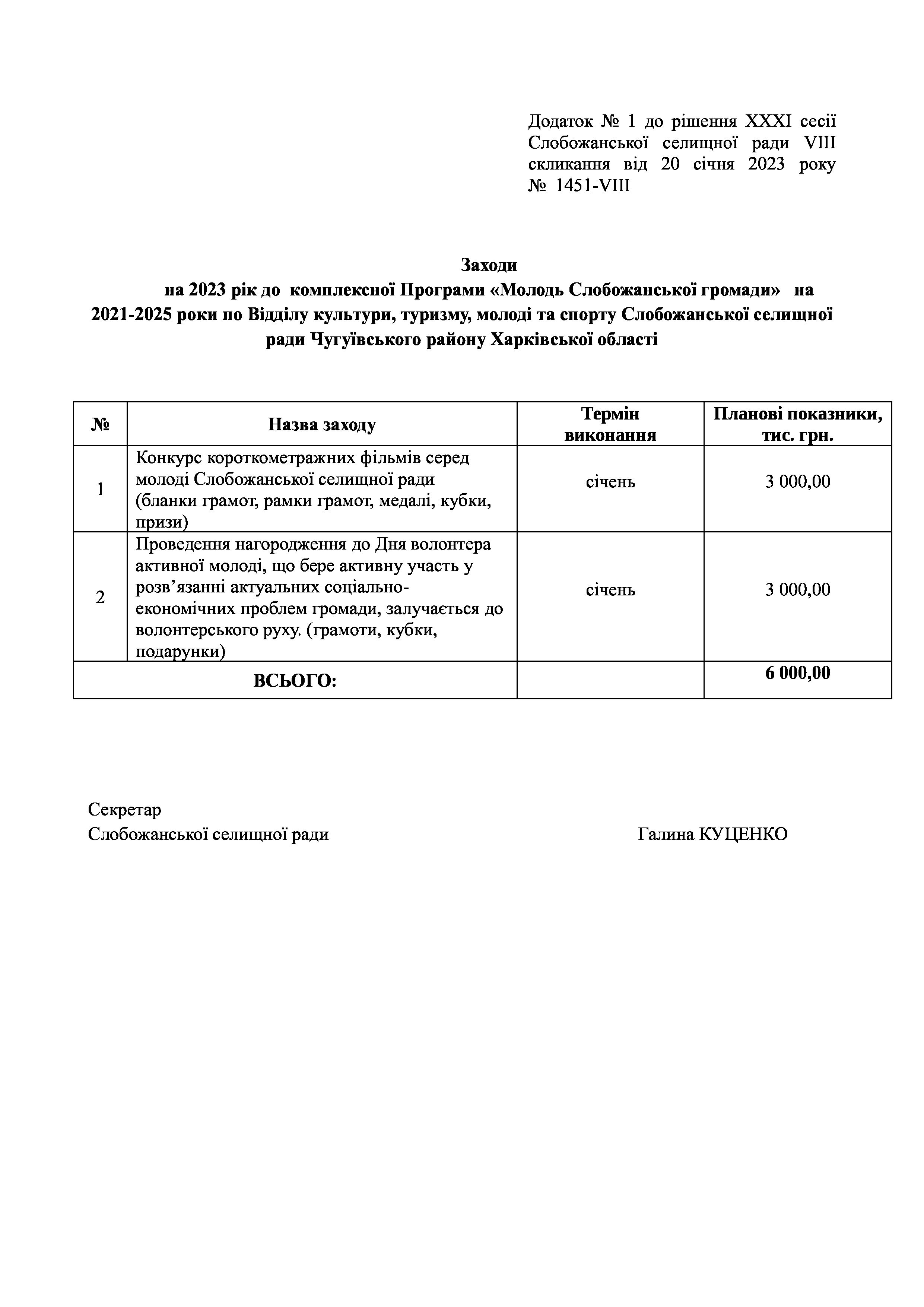 Рішення сесії №1451-VIII Про затвердження Заходів на 2023 рік до комплексної Програми «Молодь Слобожанської громади» на 2021-2025 роки.