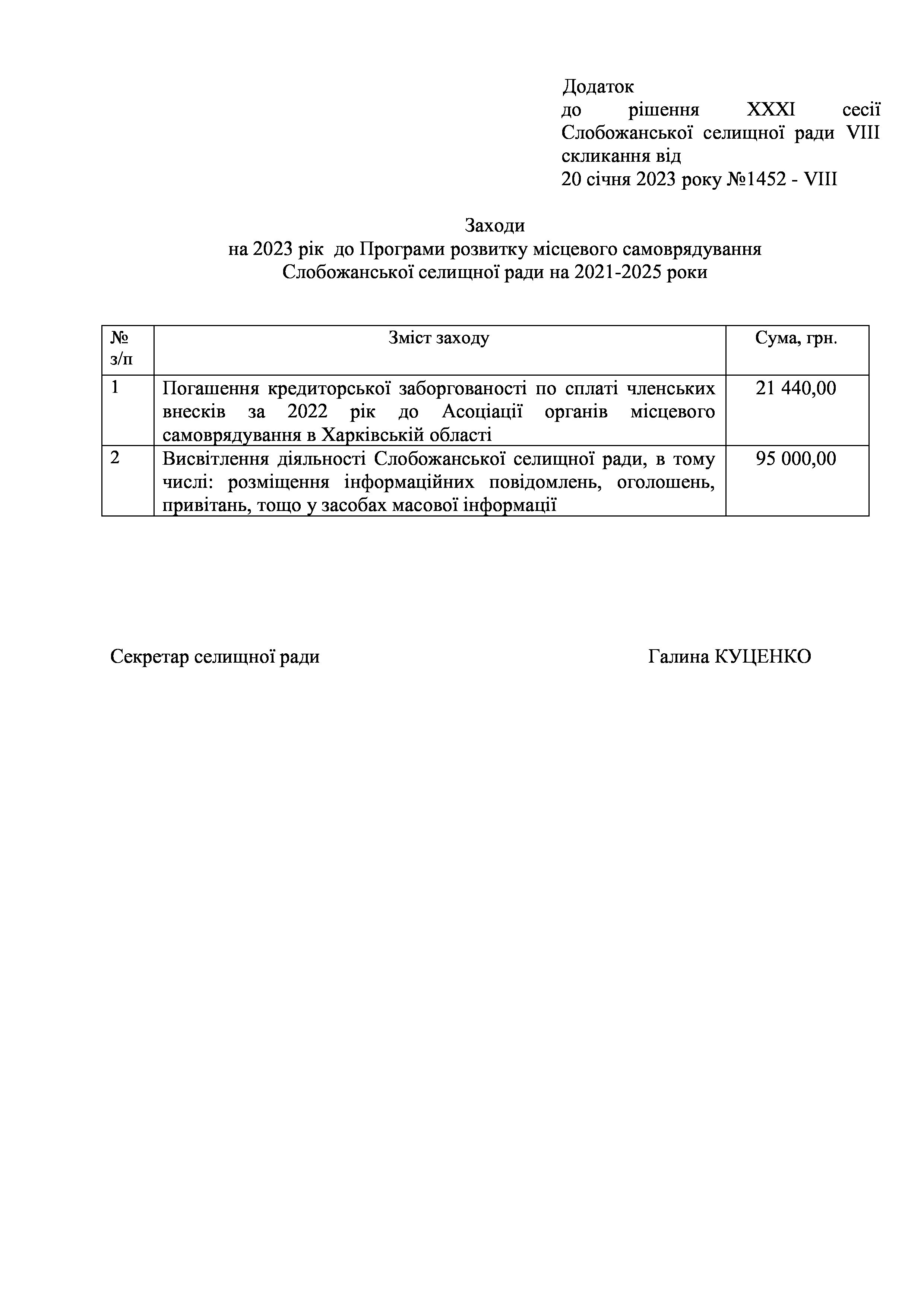Рішення сесії №1452-VIII Про затвердження Заходів на 2023 рік до Програми розвитку місцевого самоврядування Слобожанської селищної ради на 2021-2025 роки.