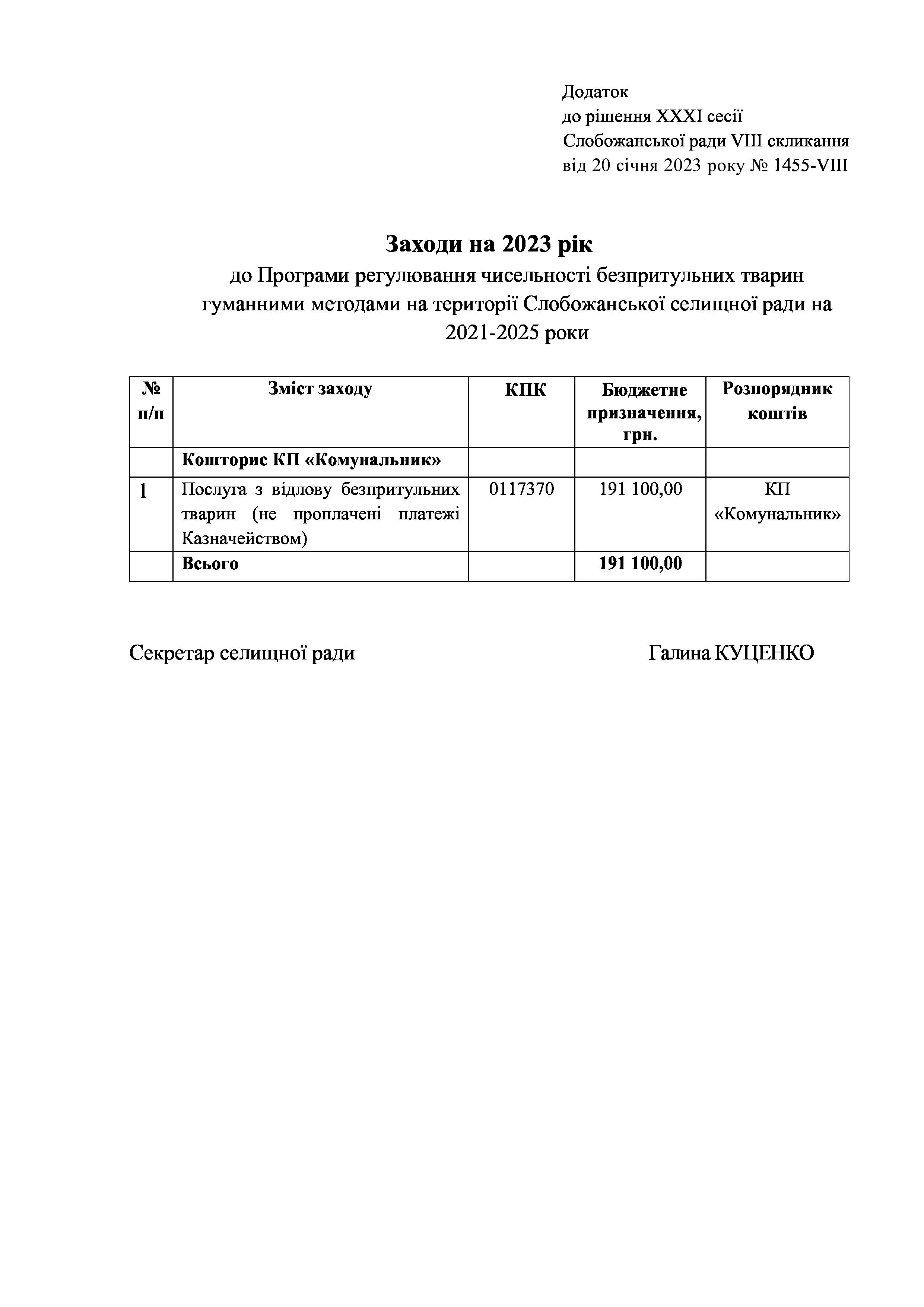 Рішення сесії №1455-VIII Про затвердження Заходів за 2023 рік до Програми регулювання чисельності безпритульних тварин гуманними методами на території Слобожанської селищної ради на 2021-2025 роки.