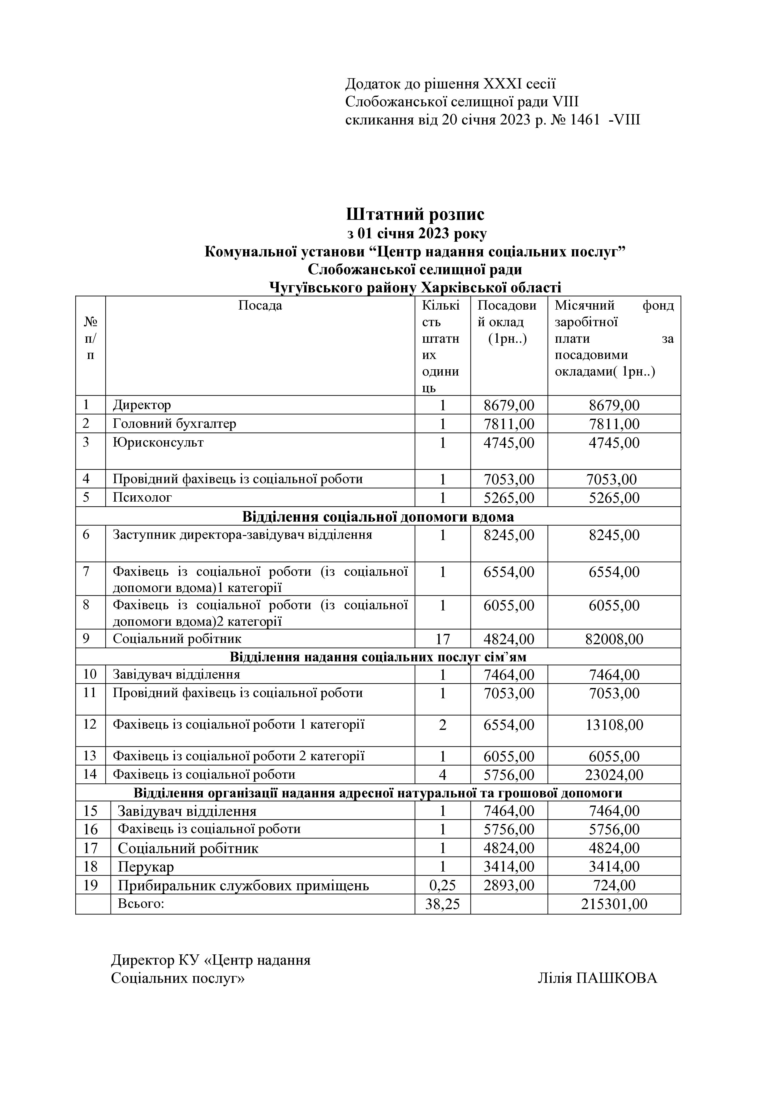 Рішення сесії №1461-VIII Про затвердження штатного розпису та штатної чисельності Комунальної установи «Центр надання соціальних послуг» Слобожанської селищної ради Чугуївського району Харківської області.