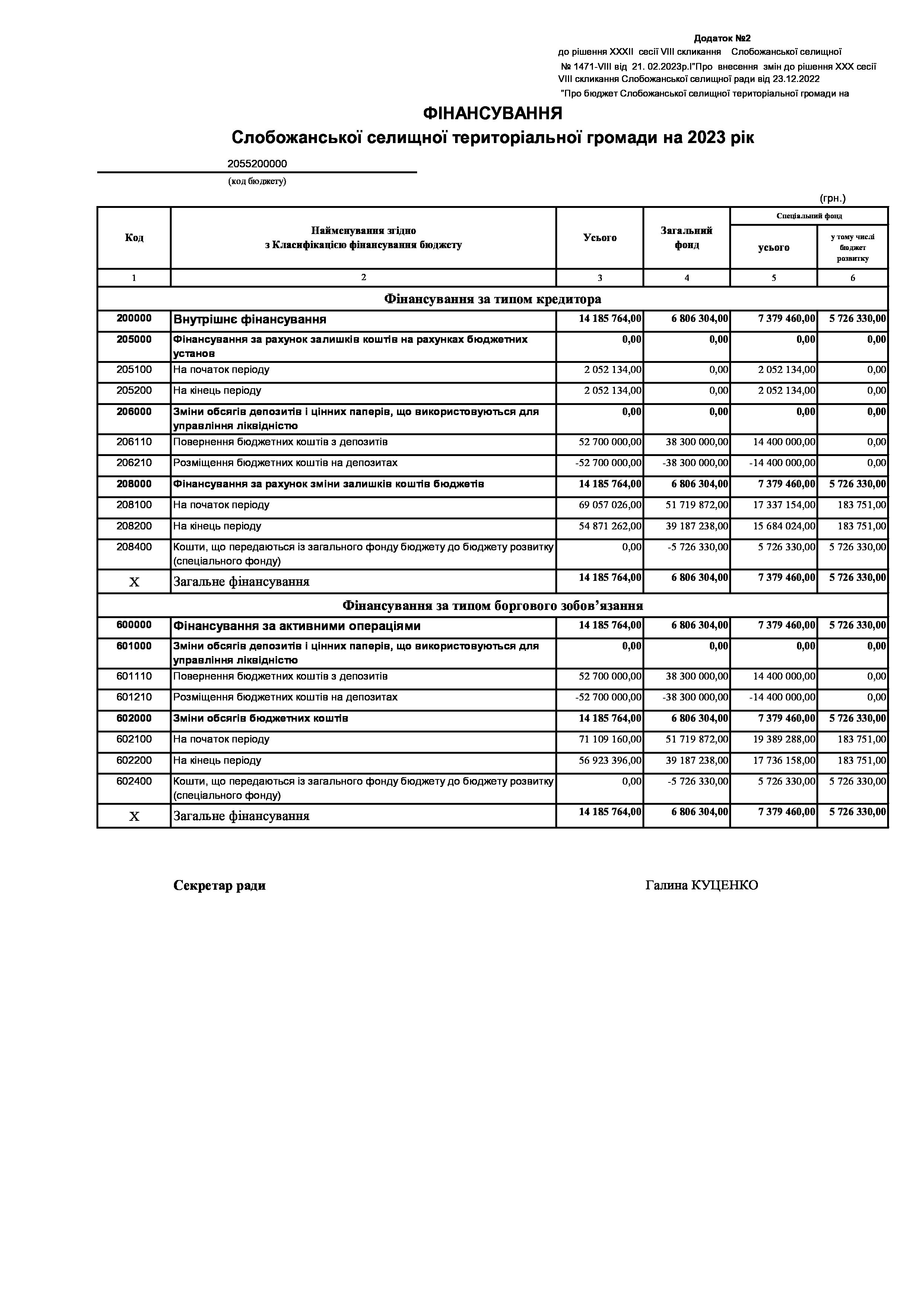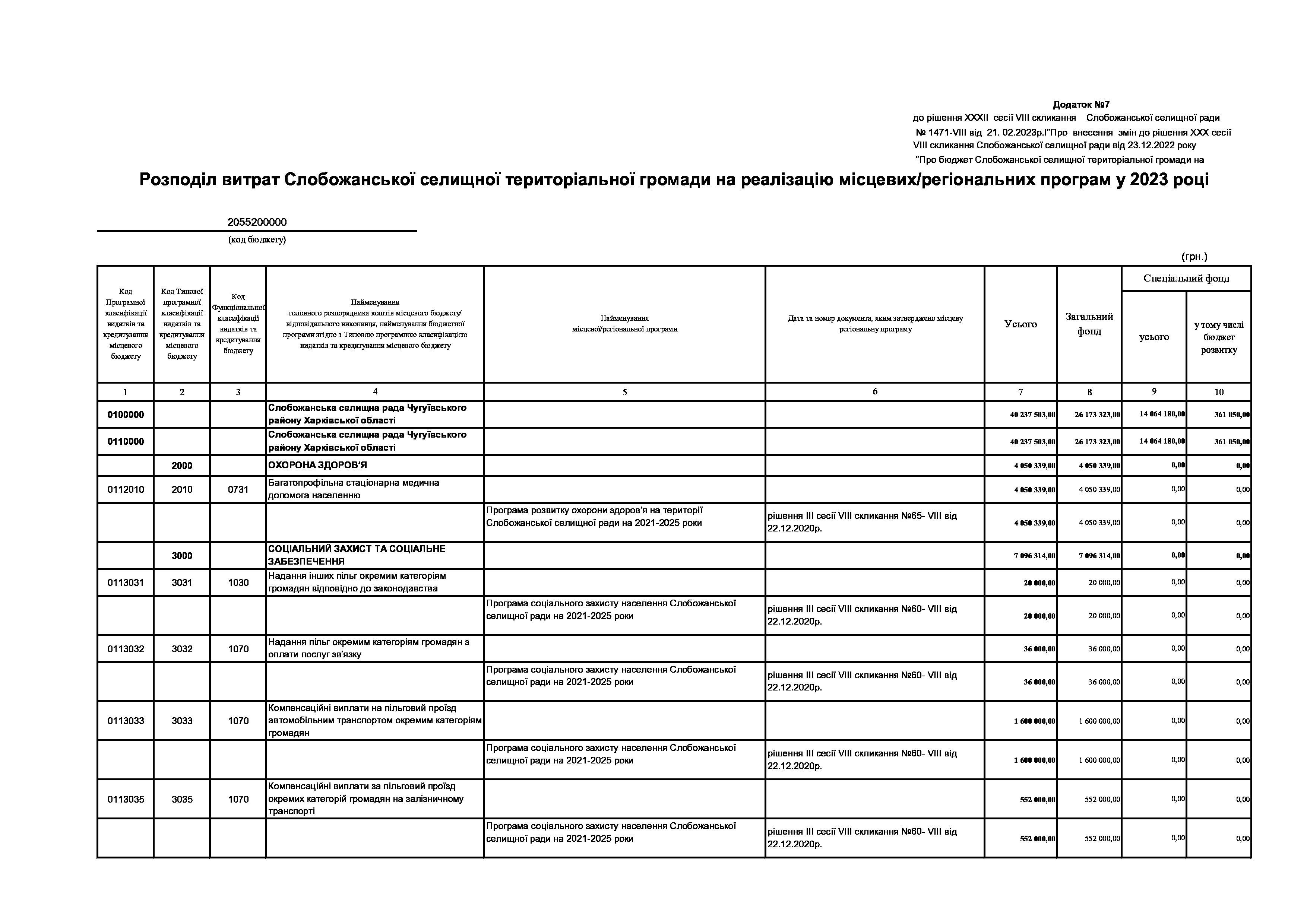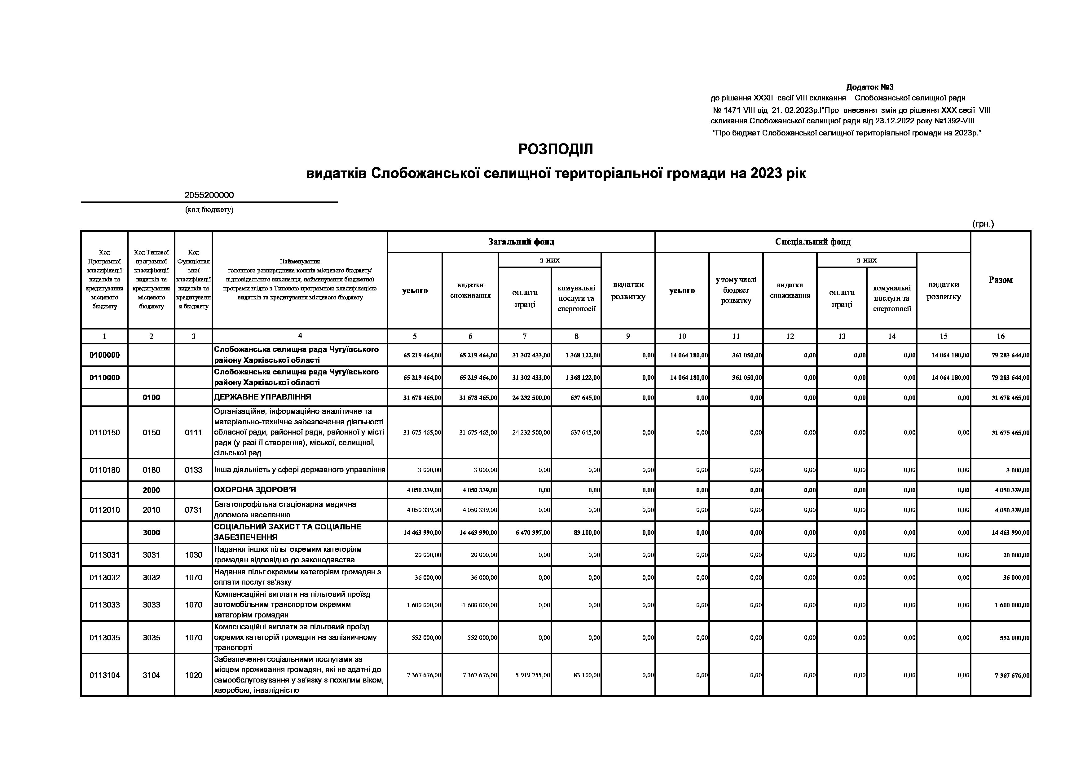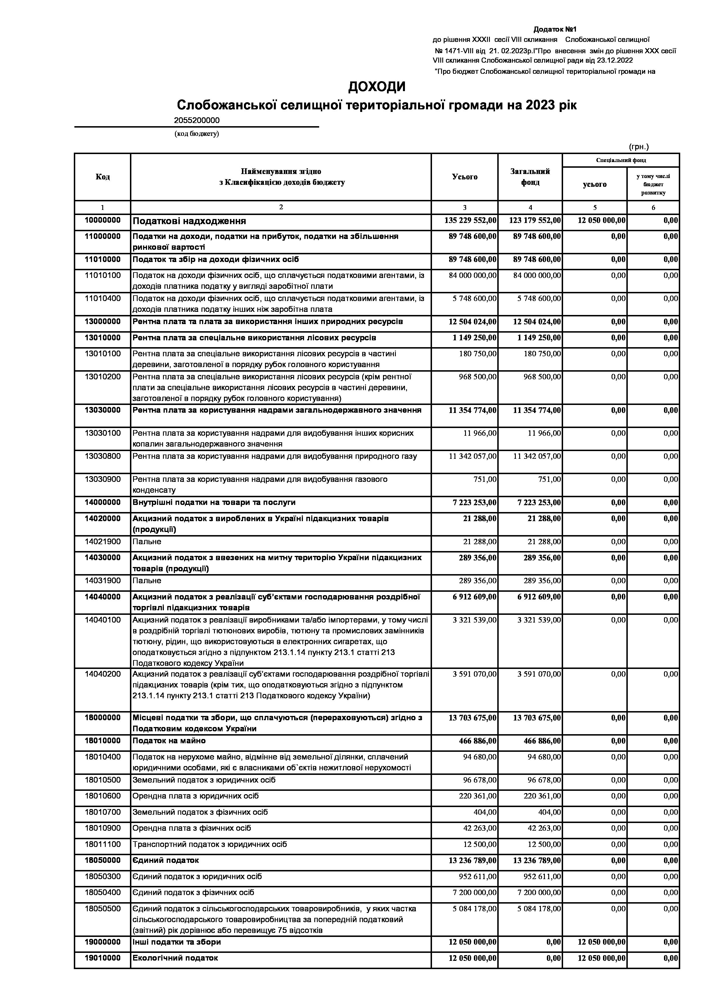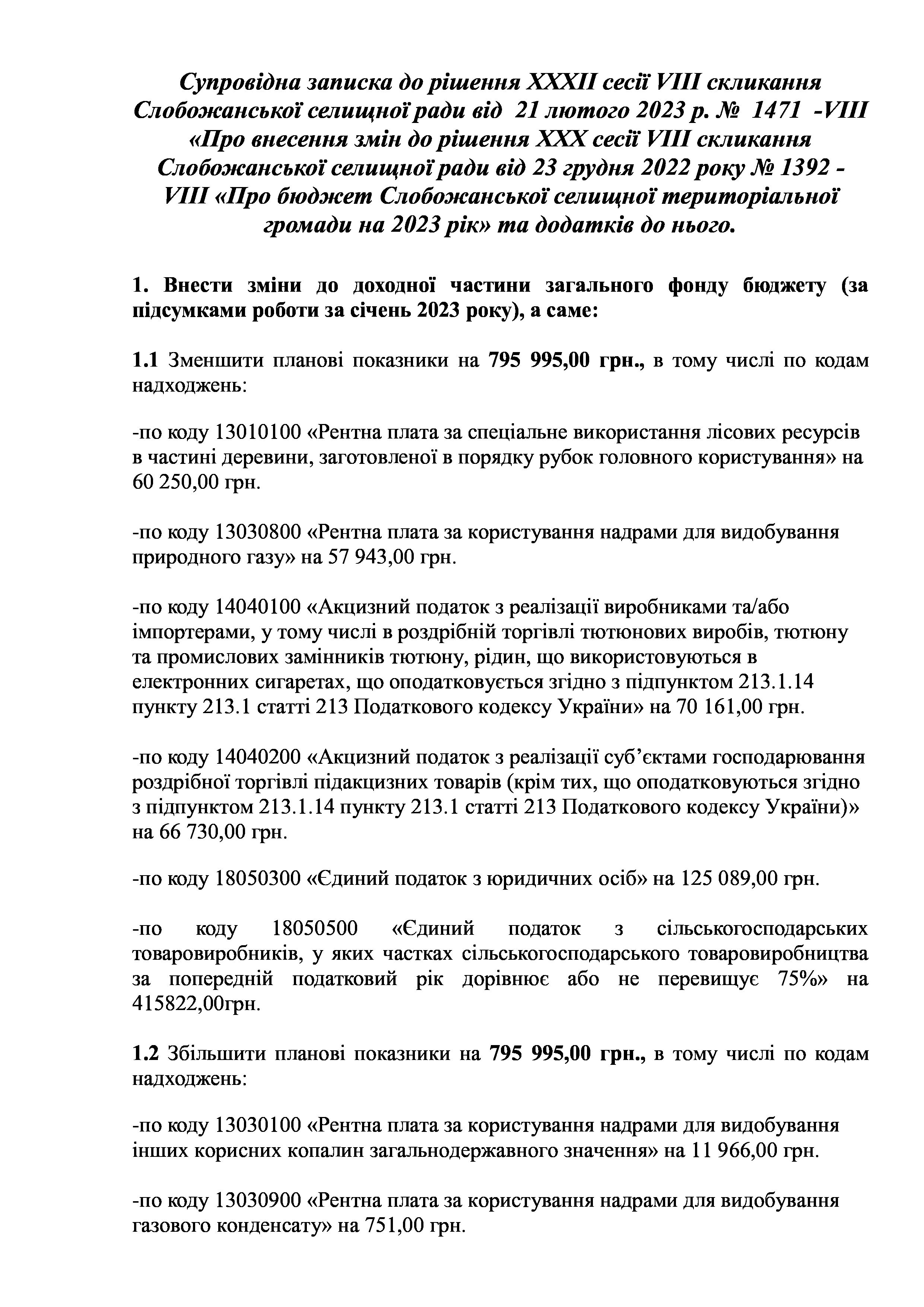 Рішення сесії №1471-VIII Про внесення змін до рішення ХХХ сесії VIІI скликання Слобожанської селищної ради від 23 грудня 2022 року №1392-VIІI «Про бюджет Слобожанської селищної територіальної громади на 2023 рік».